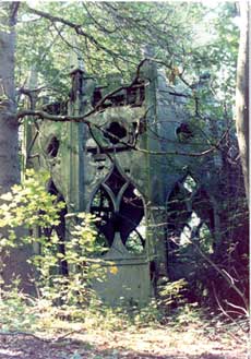 The Gothic Temple, before restorationJanie's opportunity to explore the park arose through a friend, whose mother was resident in part of Painshill House. Together, the pair began to push their way through thick, tangled undergrowth, and trees so crowded they cut out the light.