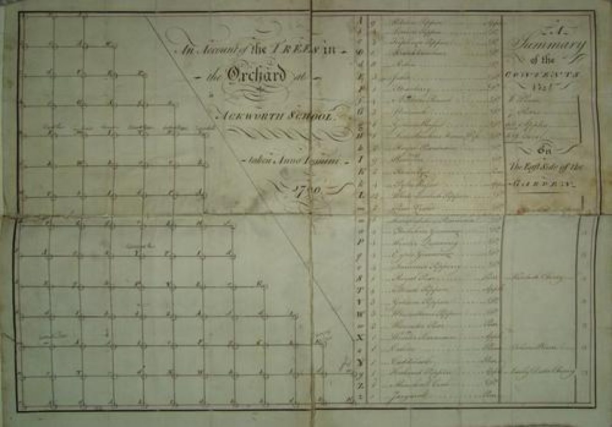 The kitchen gardens remained in use into the early-20th century, and notebooks of the produce sold to the school have survived. A planting plan of 1790 details the varieties of apple, pear, plum and cherry planted in the orchard. A list of kitchen garden produce from 1891 is given in the 'historical planting' section of this entry.