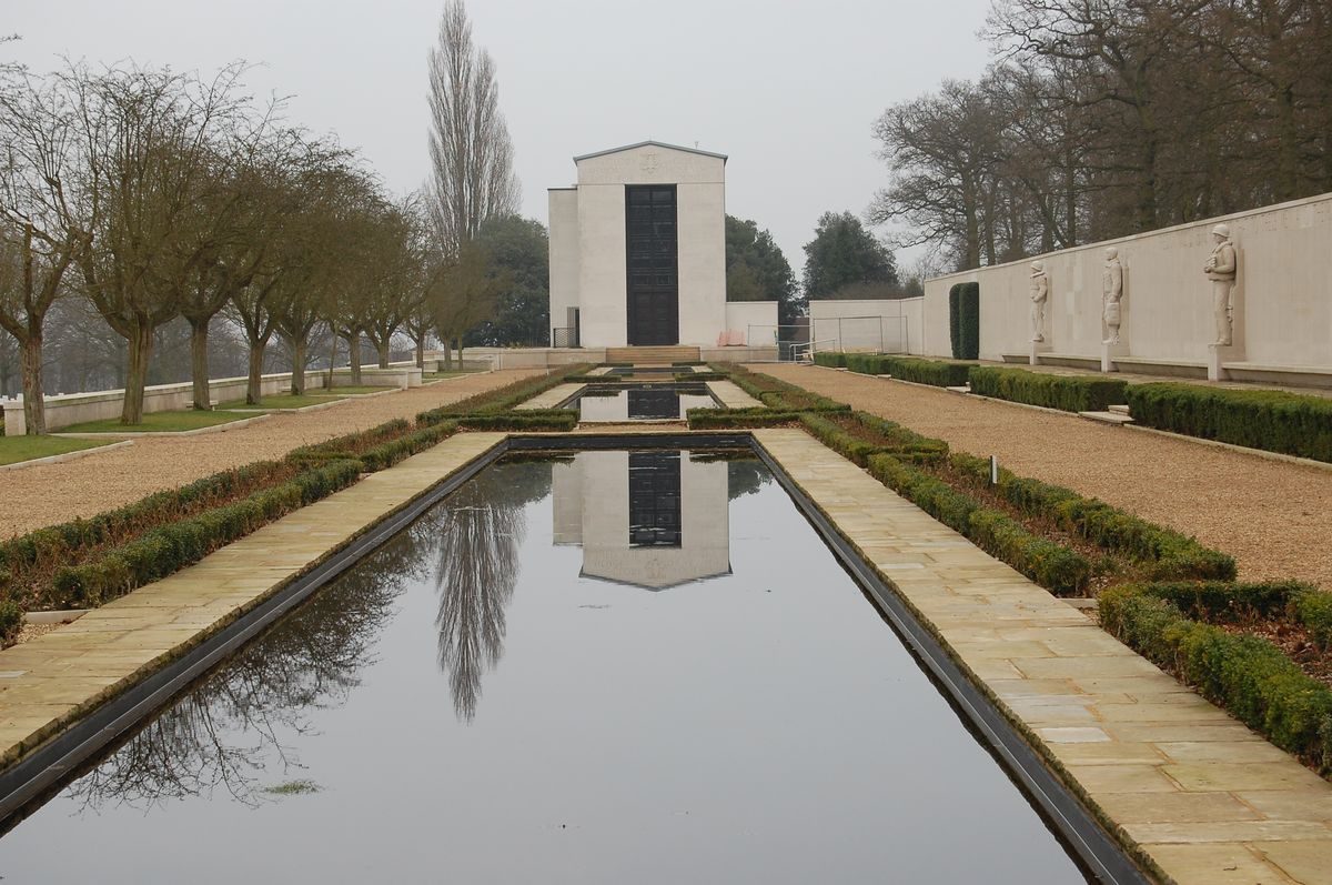 On the main axis to the east of the flagpole lies the Court of Honour. This area is reached by wide steps which descend from the platform into a garden area enclosed by low Portland stone walls to the north and the high Wall of the Missing to the south, which is inscribed with the names of those lost while serving in Britain during the Second World War. Between the south side of the Wall and the south boundary is an oak grove which contains areas for parking. Within the garden itself are three long rectangular reflection pools, bordered by rose beds, which stretch between the flagpole area and the Memorial at the eastern end; along the low northern boundary wall is a line of hawthorns. The Memorial chapel looks west and behind it, below its eastern facade, is a small enclosed garden area.