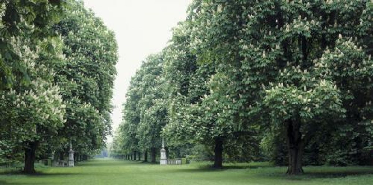 Cross Avenue: planted with planes and chestnuts with two 18th-century obelisks at the entrance, the avenue terminates at each end in a circle of trees; one of Birch, one of Lombardy poplars, and each contains a central vase.