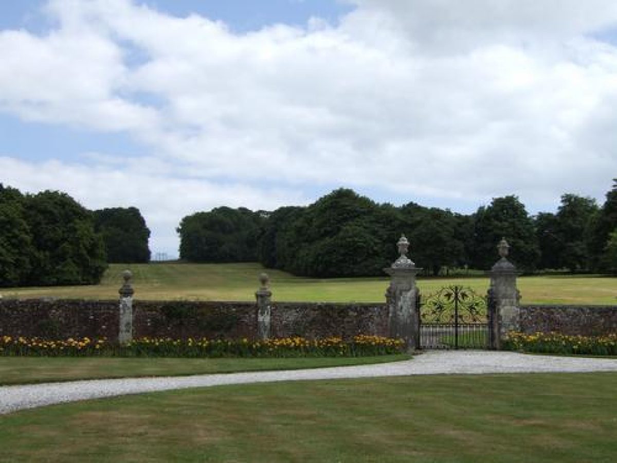 To the south-east of the forecourt a wide avenue of horse chestnuts ascends a north-west-facing slope for c 200m to reach a late C19 wrought-iron clairvoie (listed grade II) which closes the vista on the skyline. Modelled on a C17 gate screen at Beddington Manor, Surrey which had belonged to Sir Nicholas Carew, the clairvoie was originally placed at the north end of the late C19 formal garden north of the house; it was moved to its present position by Philip Tilden in 1948. The chestnut avenue was planted by Sir Reginald Pole-Carew in the early C20 as part of a projected south approach; this remained incomplete in 1914 and was abandoned after the First World War.