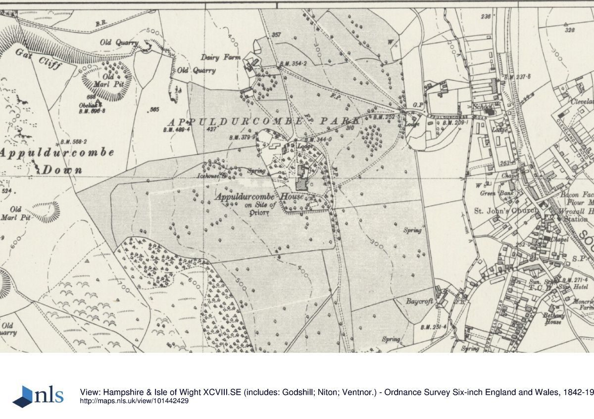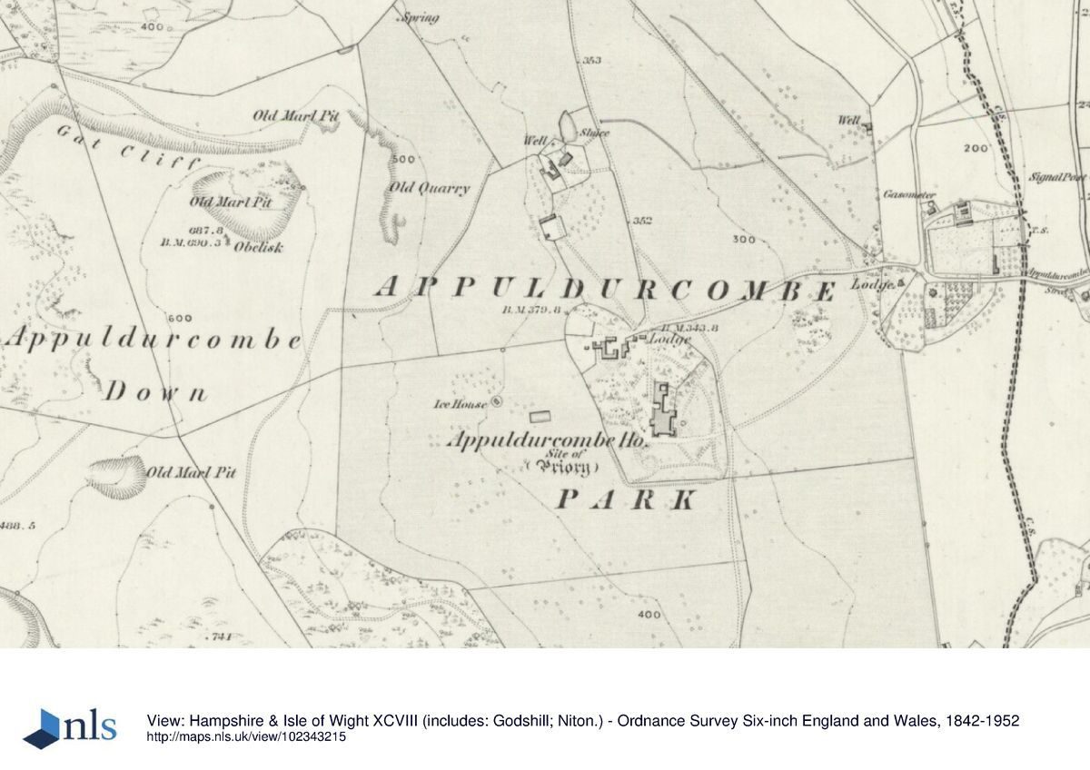 Although the land was almost certainly farmed from the period of the founding of the abbey, there is no documentary evidence for the existence of a medieval deer park. There are references to Appuldurcombe Lodge, a deer lodge, from 1557 onwards and references to a deer keeper in the late C17 which implies the existence of a park. There are references to ‘a new park' and ‘new lodge' by 1708 and its boundaries were first recorded on Andrew's maps of 1769 and 1775. Appuldurcombe Lodge is shown as a deer lodge on Brown's plan of 1779.