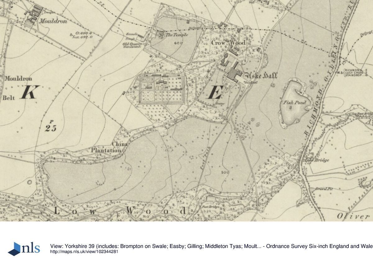 The south-east side of the Hall overlooks open grassland with scattered clumps of oak. A lake lying c 300 m south-east of the Hall is of oval shape with an irregular eastern shoreline sheltered by trees. A folly in the form of a temple (c 1770, listed grade II) lies on a promontory close to the north end of the east shore. The lake is shown on the 1761 map when it had a fairly regular shoreline and a stepped cascade on the south side fed by a canal running south, with water supplied from the sluice running from the Aske Beck. The 1813 map shows the modified irregular outline of the lake overlaid upon what appears to be a tracing from the 1761 map, complete with canal and cascade. A small island is marked, which is also shown on the 1857 OS map but not on that of 1957. The canal and cascade are not shown on the 1857 OS map.