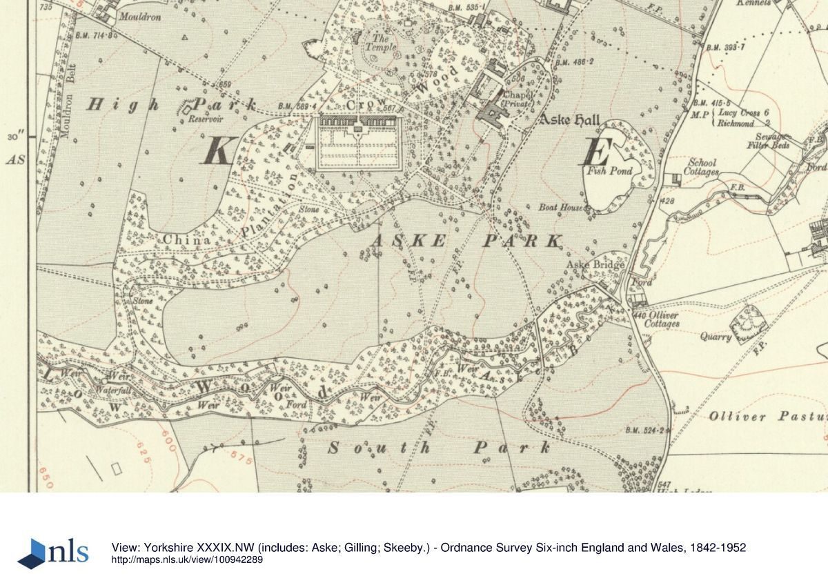 Pleasure grounds alongside Aske Beck are reached from a system of paths through China Plantation into Low Wood, through which the Beck runs. There are also paths running south from the garden across the park which join the beck-side path c 500 m south-west of the Hall. The Beck follows a winding course in a narrow valley and runs over a series of cascades starting at a point c 1.2 km south-west of the Hall. A circular stone-lined pool c 1.1km south-west of the Hall is marked on the 1761 map, but little trace survives of two pools shown to the west of it.