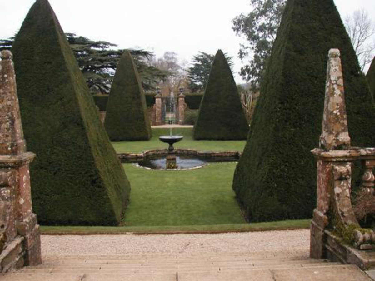 The garden comprises a central sunken lawn planted with a symmetrical arrangement of twelve monumental pyramids of clipped yew around a central pool and tazza fountain. The lawn is enclosed by a slightly raised gravel walk, while to the south-west, a centrally placed flight of stone steps ascends to a raised, stone-flagged terrace which overlooks the garden. The terrace is enclosed to the north-east by a balustrade broken by regularly spaced stone piers surmounted by stone obelisks. The piers bear, on their outer or north-east side, a series of lead masks which formerly spouted water into a narrow canal below the terrace's retaining wall. This canal is now (2004) converted into a planting bed.