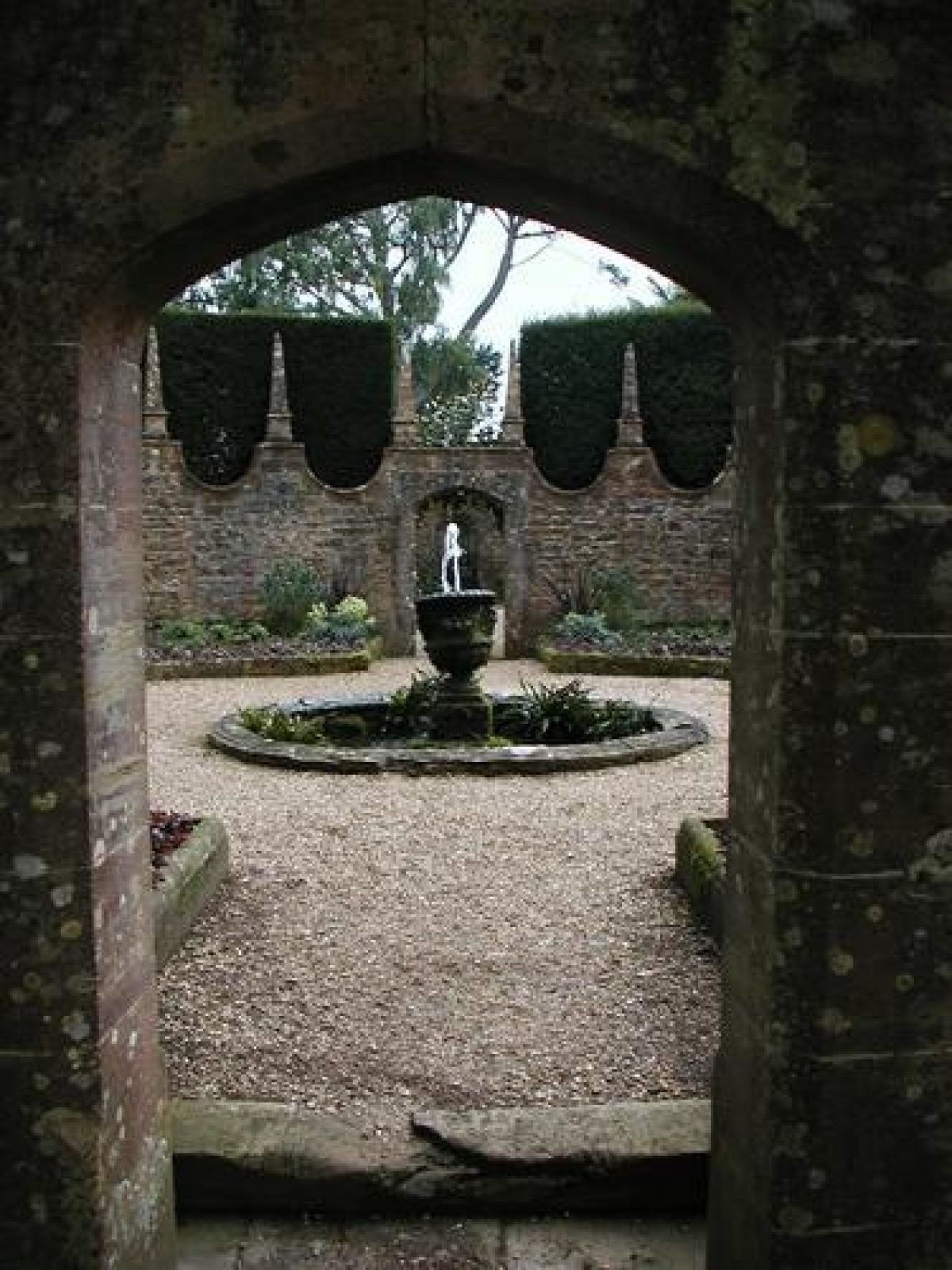 To the south-east of the Corona, a Tudor-gothic arch leads to the Lion's Mouth, a small garden totally enclosed by stone walls, with a semicircular stone-kerbed pool to the south-east backed by an alcove and wall fountain placed on the central axis running through the Corona to the forecourt. The pool is flanked on each side by stone archways leading to the Lime Walk. The garden is laid out with rock-edged perimeter beds planted with a late C20 collection of plants, some acquired from the Abbey Garden at Tresco (qv).