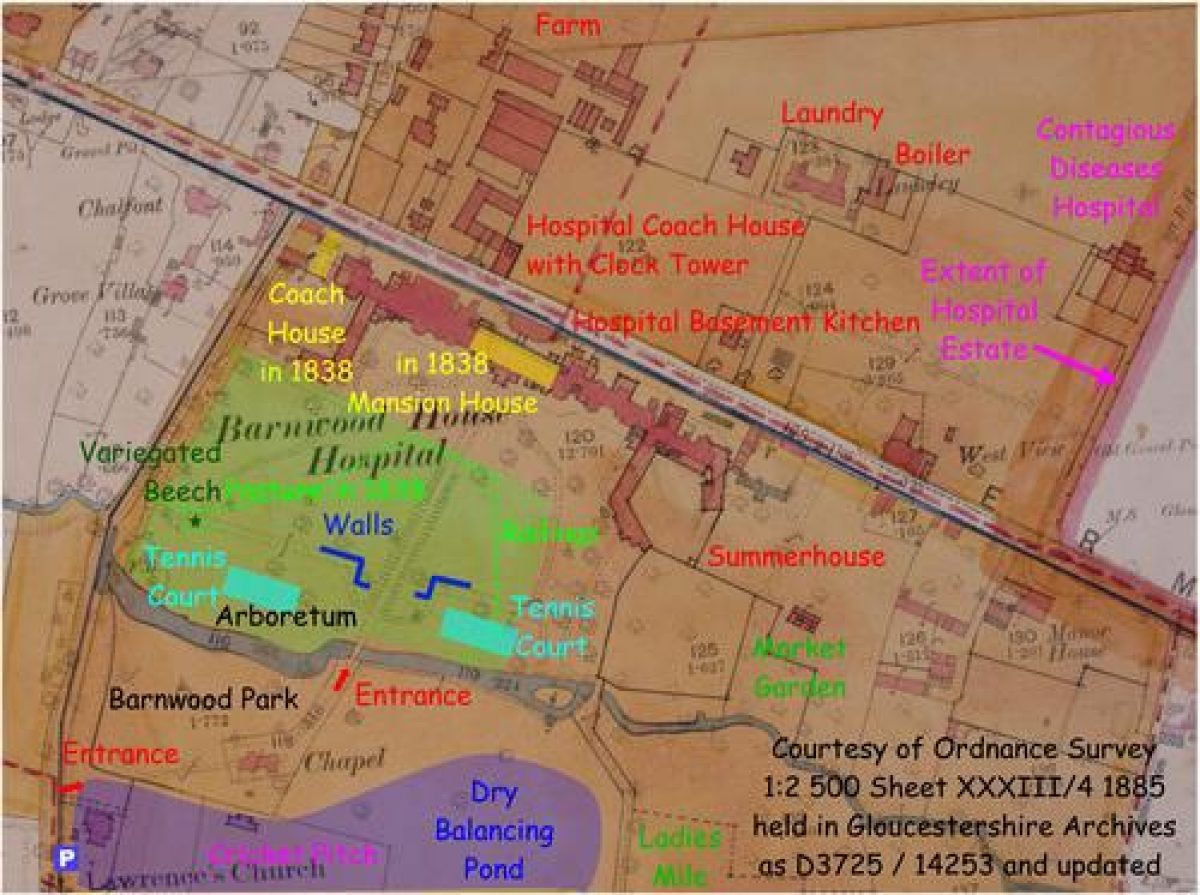 Opposite the hospital many scots fir trees were planted. These are at present in British Energy's grounds. That was one of many firms to build in the Barnwood development on previously hospital owned land now accessed by vehicles solely from the A417 Barnwood bypass.