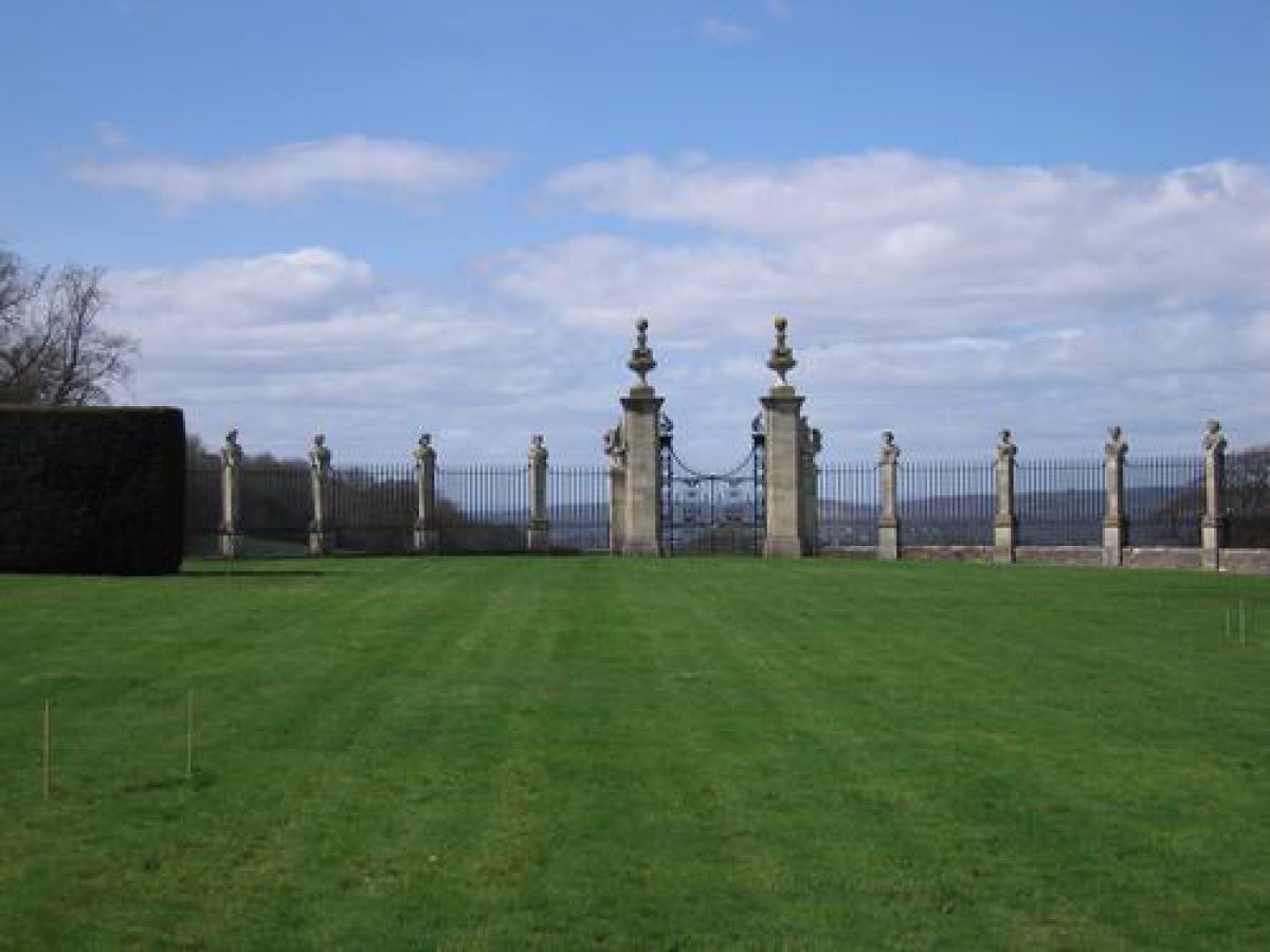 Wrought iron gates with steps lead through to the parkland on the north-east and north-west sides. There are many urns and summerhouses in different places in the formal garden, all carefully placed. Twelve statues around the gates on the north-west side of the garden represent the months of the year, each one being inscribed with the name of the month in Latin. To the south-east of the formal garden is the shrubbery, formal in character, with more statuary and other garden buildings.