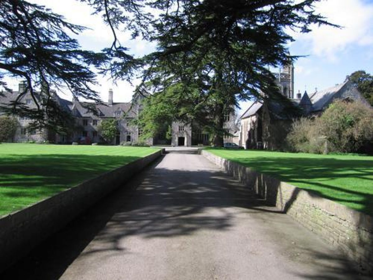 Barrow Court is a medieval building, much altered and extended in the 1880s. It is surrounded by large formal gardens and a larger informal park. The building is approached along a straight drive with lawns on either side. There are large mature cedars on the lawns. Another lawn at the back of the main building is informally planted with mature trees.
