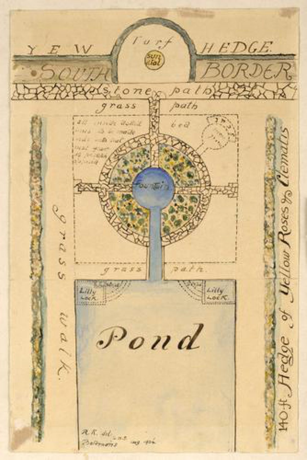 The lawn on the south-east side of the path extends c 15m in that direction to a low, drystone retaining wall with four sets of steps built from un-dressed stone. These lead down onto a large, rectangular, lower lawn. On the north-east half, an avenue of pleached limes runs south-eastwards across the lawn to a niche in the yew hedge which contains an oak seat. The limes were planted in 1898, before Kipling purchased Bateman's (guidebook). The south-west half of the lawn contains a large, rectangular pond planted with waterlilies and, immediately to its south-east, a quartered rose garden with a central pool and fountain. A niche in the south-east yew hedge contains a stone sundial set in stone paving. The north-west side of the pond is screened by a length of yew hedge on top of the retaining wall. A central niche in both frames a curved oak seat. The pond and rose garden was designed by Kipling and his drawing for it survives at Bateman's. His plan shows a border against the south-east yew hedge and also a '140' Hedge of Yellow Roses and Clematis' along the south-west side of the pond but these have not survived. The present fountain was installed by the Trust in the mid 1990s to replace the original which was stolen.
