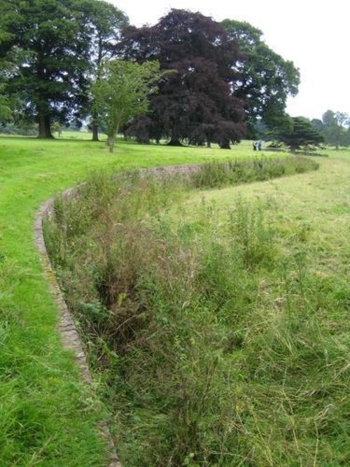 The gardens to the south and west of the Hall are enclosed by a ha-ha (listed grade II) which curves around a patch of woodland immediately north-west of the Hall, shown on an estate map of 1841, and continues around the south front and returns on the east side of the American Garden.