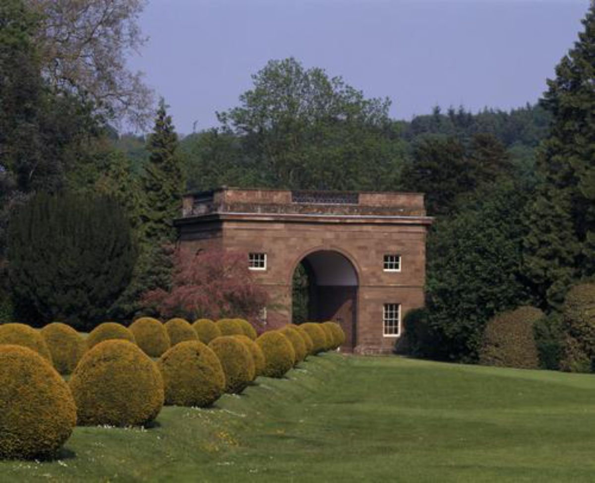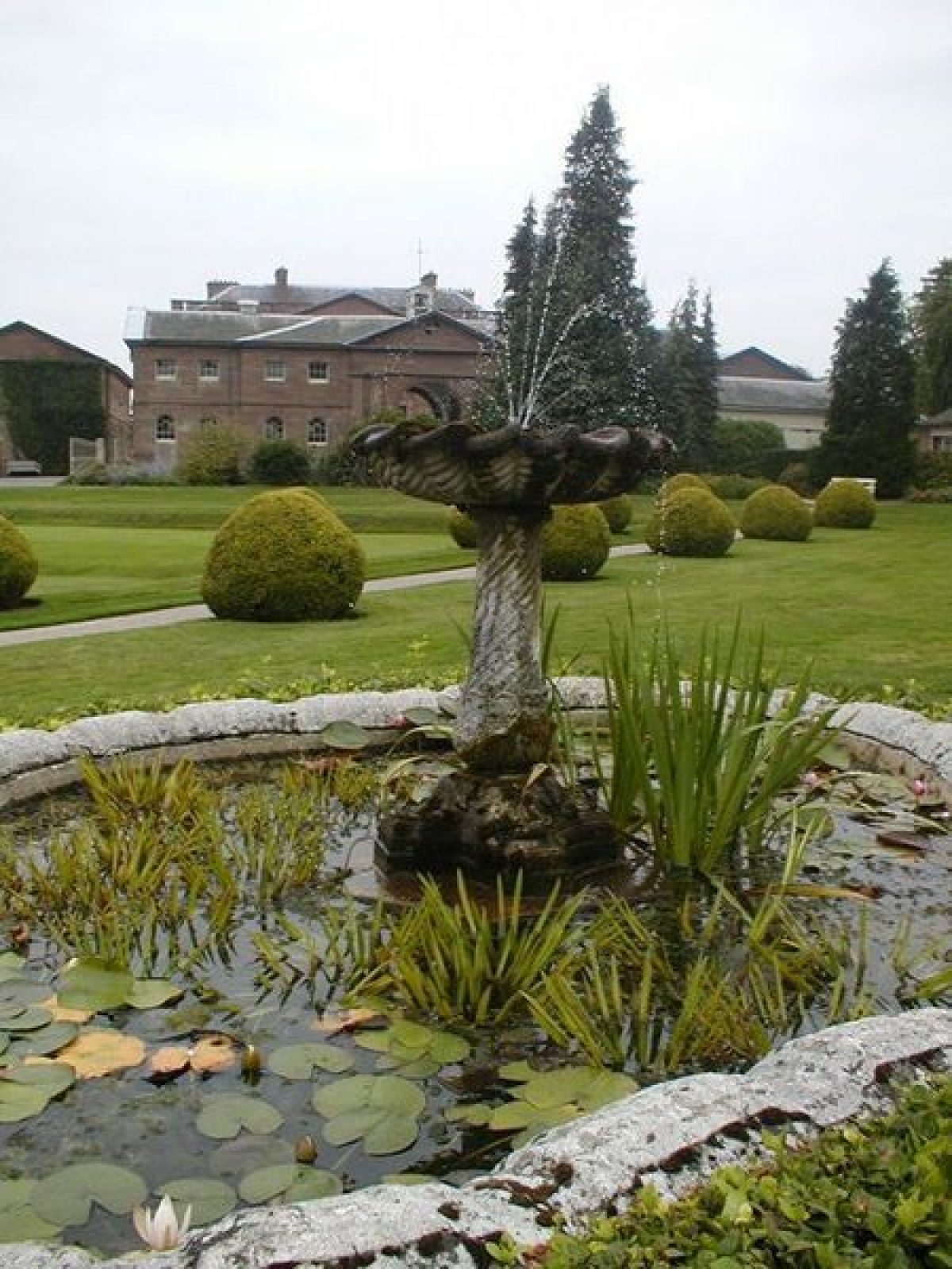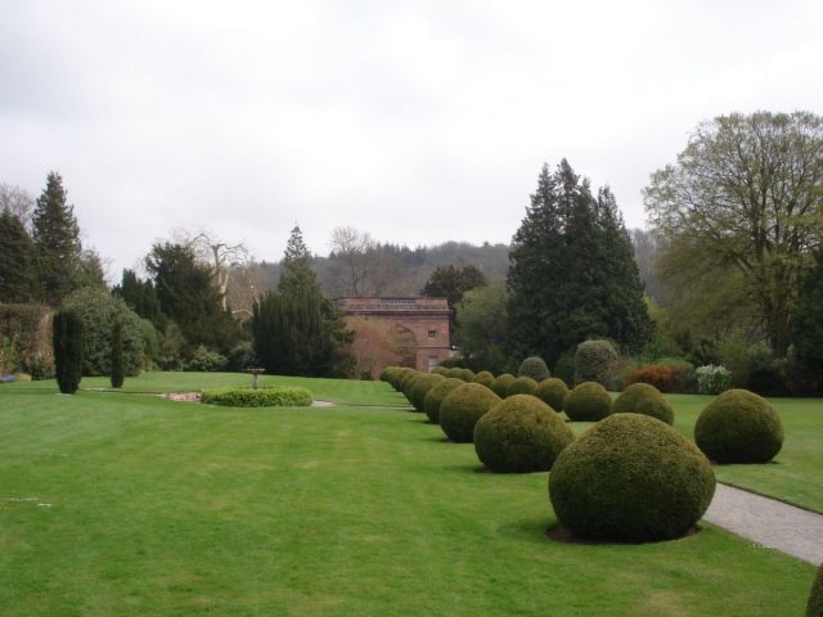 The gardens and pleasure grounds are separated from the park by a ha-ha, part of which was re-excavated and restored in the 1980s and 1990s. A lawn runs between this and the front of the Hall. To the north of the Hall complex is a shrubbery walk with conifers, expanded in the early C20. That obscures a view north-west to the Black Hills from an alcove in the side of the office range, which is mirrored by one in the south wall from which views across the park and to Long Wood are enjoyed. Extending between the east range of the offices and Holland's entrance lodge, and bounded to the north by the kitchen garden wall, is a further lawn, slightly terraced and crossed by a path to the lodge bounded with golden yews clipped into low domes. Those were planted c 1901 when Dobies of Chester are thought to have carried out a scheme of improvements in the garden. Flower beds flanking the path were eliminated in the 1970s. To the south this lawn and the Eastern Drive which curves around it are bounded by a screen of specimen trees and shrubs, while on the lawn's northern part, adjoining an arched entrance to the kitchen garden, is a small stone fountain with basin, already present in 1887.