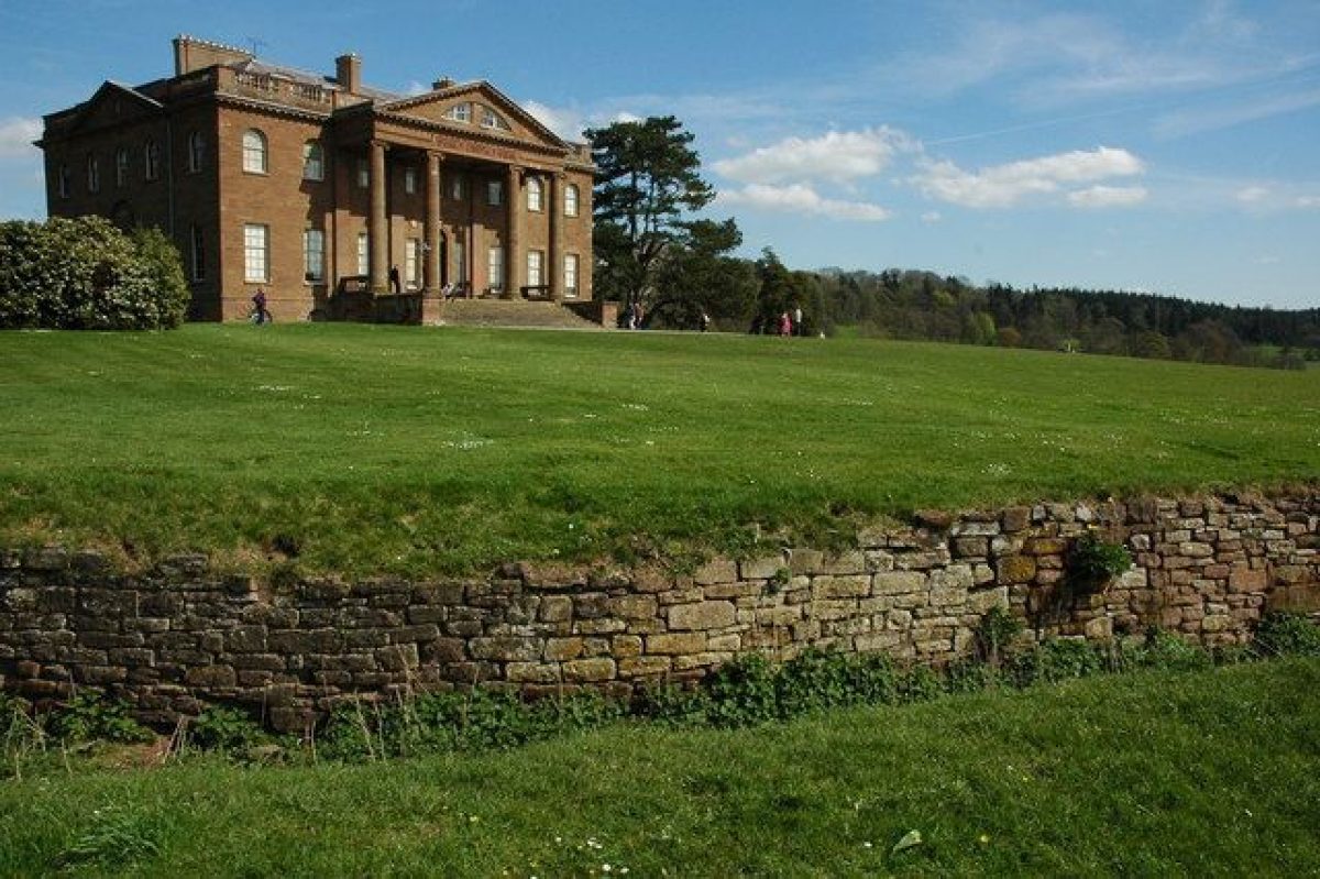 The Hall stands on a knoll, with the main views being to the south, across the greater part of the park. Down the eastern side of the park the ground rises up to a ridge.The house is approached from the A49 via Holland's triumphal-arch lodge. The house faces south-west, looking out over a ha-ha towards the park, which is scattered with trees and extends southwards towards the artificial lake known as Berrington Pool. The view from the house extends to the silhouette of the Black Mountains to the west. There is a brick-walled kitchen garden and a tiled dairy. There is a flower garden between the lodge and the house.