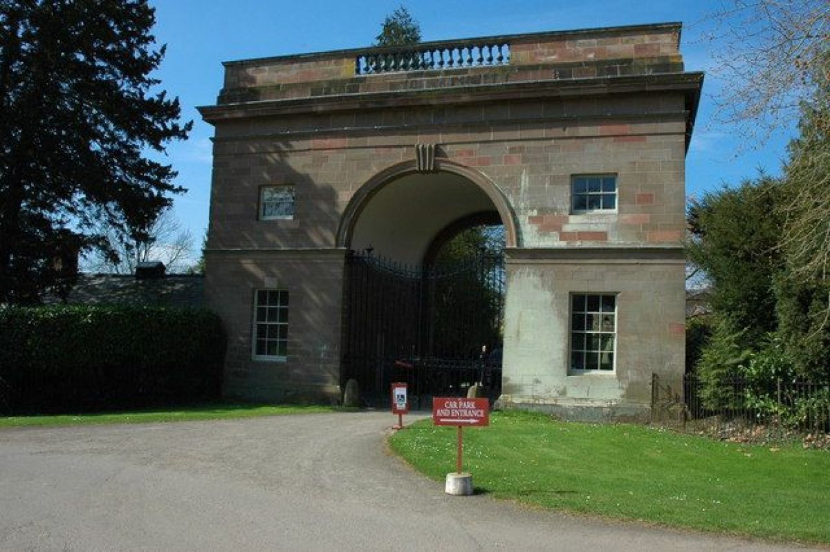 The main approach to the Hall is that from the north, which approaches from a late C19 gate lodge on the Ashton to Moreton road. That drive curves east, around the outside of the immediate grounds of the Hall, which it enters via an imposing sandstone ashlar Triumphal Arch, the Gardener's Lodge (listed grade II), part of Henry Holland's work at Berrington. From here the drive curves west before turning as a carriage sweep to the main, south-west-facing porticoed front of the Hall. The drive then continues north, to the area of the former stables (demolished c 1900 when the drive was realigned) north of the kitchen gardens, before continuing as a back drive to the north gate.