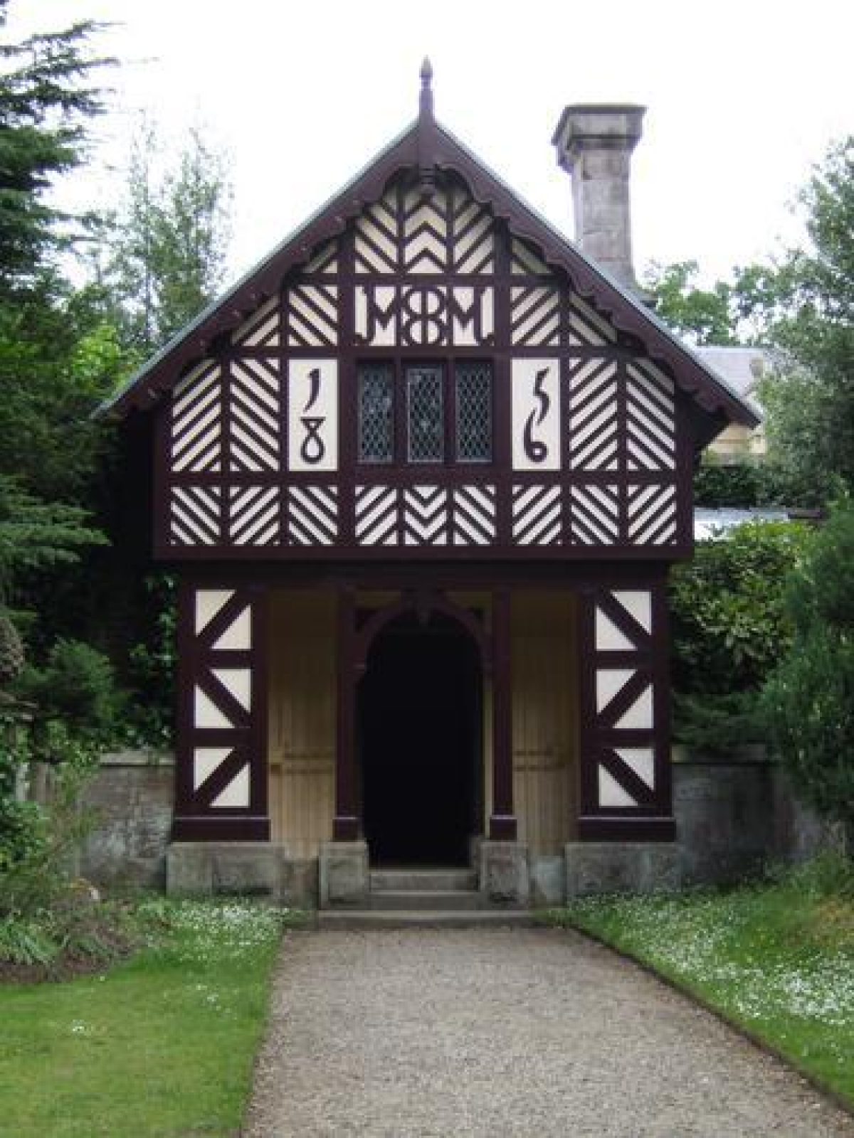 The upper storey of the Shelter House gives on to The Stumpery, a sunken path bordered by stumpwork , which leads south to China, and (via a tight turn northward) to the eastern terrace. The terrace gives views over and along the terraced gardens south of the house, and gives access eastwards to Egypt. The last occupies a roughly square, lawned compartment, surrounded by tall yew and beech hedges. Either side of the axial path up the garden are yew obelisks with a base of golden yew. Flanking these are pairs of stone sphinxes (with temple portal listed grade II). The path leads to a stone temple portal, above which rises a pyramid of clipped yews. From the doorway a dark passage progresses to a dim chamber containing the Ape of Thoth, a stone idol probably sculpted by Waterhouse Hawkins, creator of the Crystal Palace (qv) dinosaurs. A passage from this chamber leads south, out of the structure (sometimes known as the Tea House; listed grade II), the facade of which (dated 1856) forms the Cheshire Cottage.