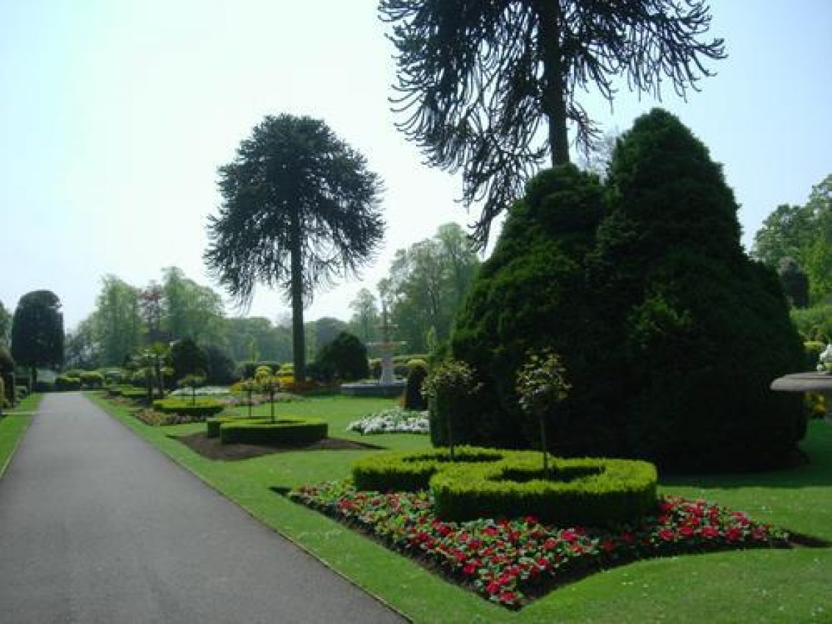 The flower garden has a traditional design with symmetrical beds cut out of the turf. Other features include a fountain which forms the centre piece of the garden.