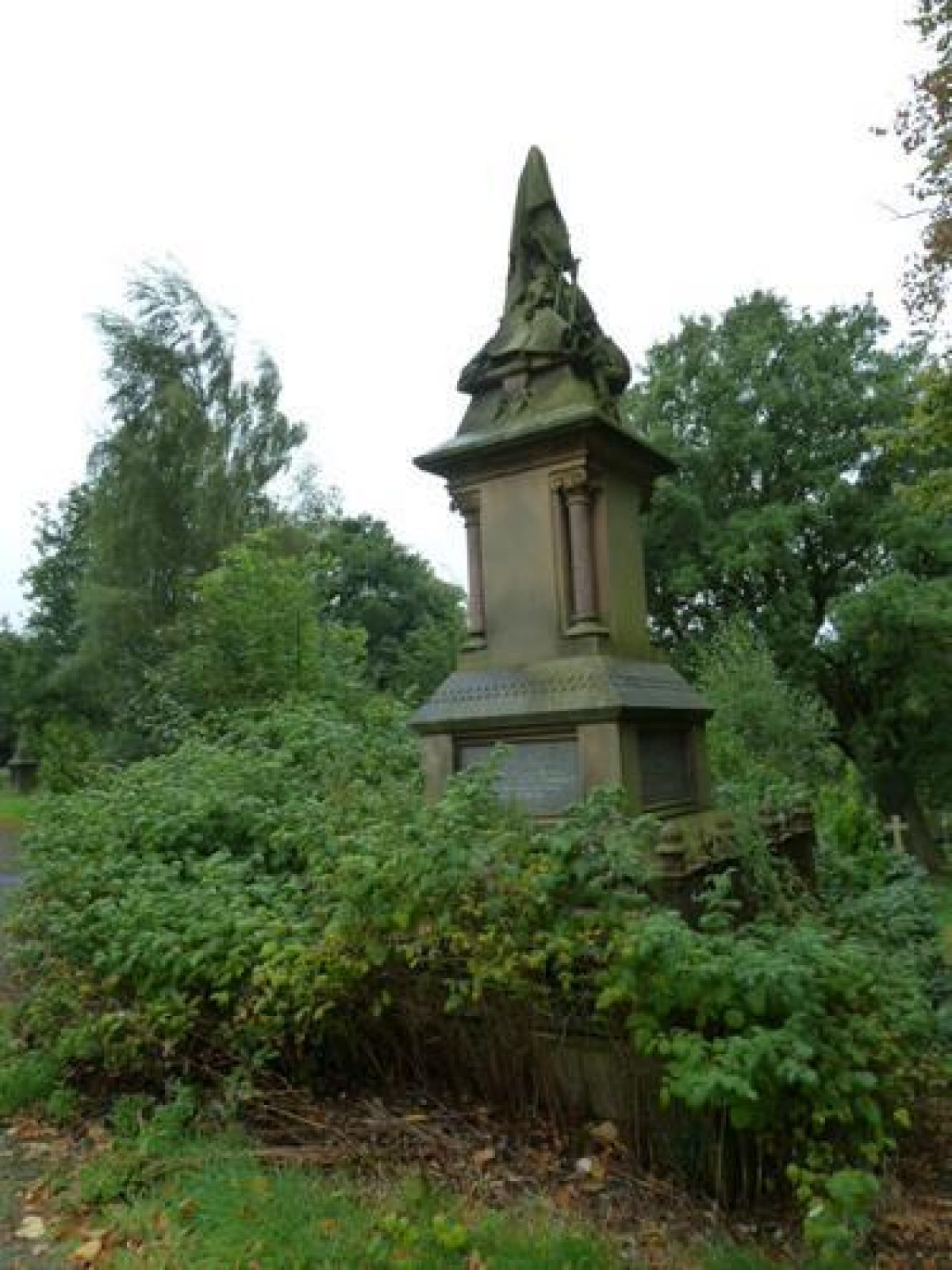 Close to the 1923 entrance there is a World War 1 Memorial. It was created in 1924 and includes an Imperial War Graves Commission Cross of Sacrifice designed by the architect Reginald Blomfield with a screen behind it showing the names of 174 servicemen buried in the cemetery between 1914 and 1924. There are also memorials to remember local people killed in the Hapton Valley pit disaster in 1962 and in a Spanish air disaster close to Barcelona airport in 1970. The gravestone memorials throughout the cemetery reflect the style of their era. Architecturally the most interesting are within the original cemetery although many may be to standard designs of the period. The graves of many of the prominent people who helped to shape the development of Burnley in the 19th century can be found. One unique memorial is that to Thomas Healey (1783-1858), 'The Father of Burnley Music'. It is topped by a sculpture of musical instruments and was created in 1872, funded by the choirs and musical societies of the district. An article in the Burnley Advertiser of 1872 states that the monument 'is original and has been designed and executed by W. Hargreaves excepting the rail which was made by Mr. Ashworth of Burnley'.