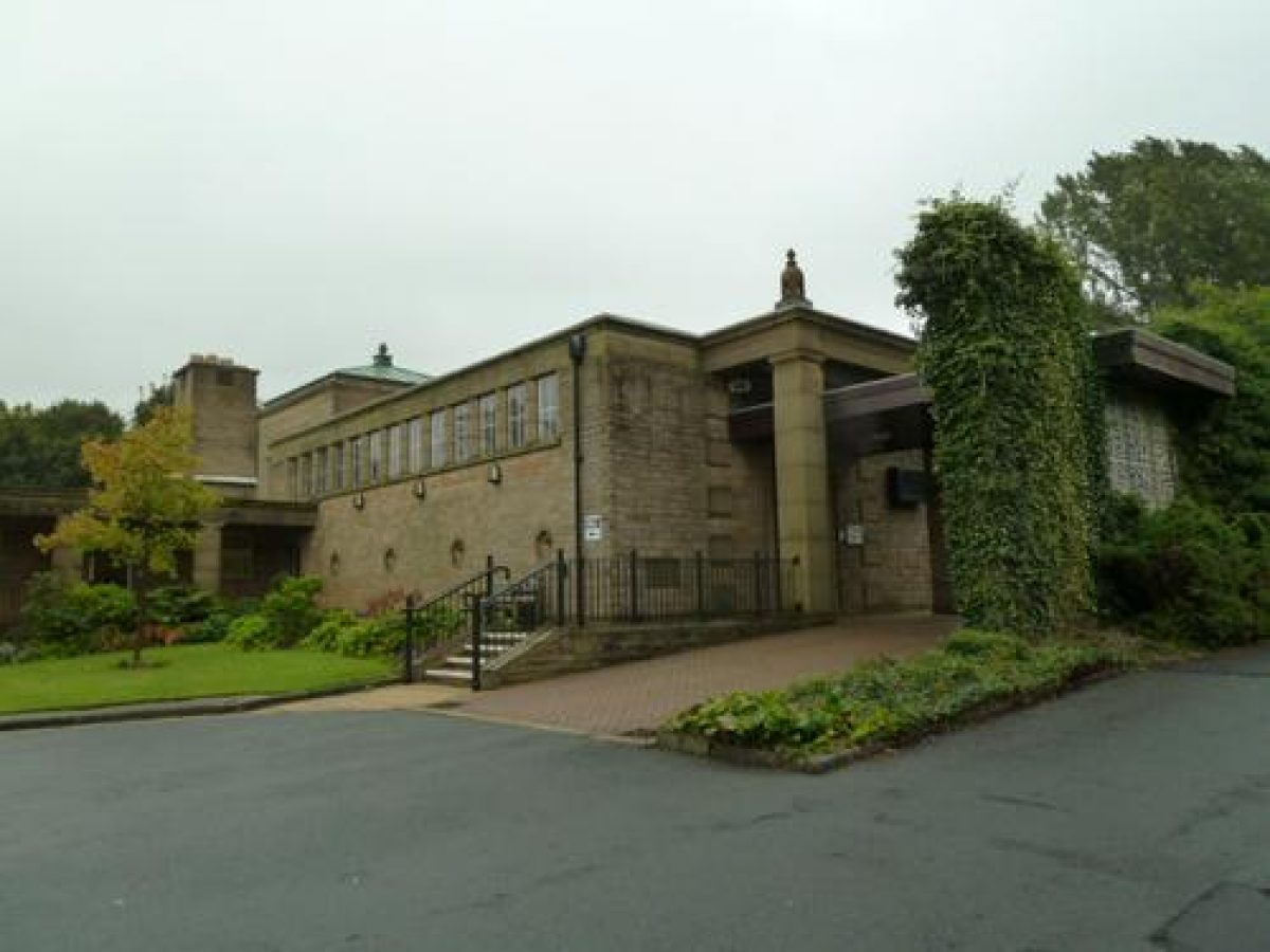 The Crematorium site with its own parkland and entrance from Accrington Road was opened in 1958. It adjoins the northern boundary of the cemetery along its western end and slopes downhill relatively steeply to the north with the crematorium sitting on a plateau on the south east of the site. There is pedestrian and vehicular access between the cemetery and crematorium. The landscaping is mainly informal with pathways meandering through light woodland, including commemorative trees. The Crematorium building was designed by Taylor, Young and Partners of Manchester. Hilary J. Grainger in Death Redesigned: British Crematoria: History, architecture and landcape describes it as with '.... strong classical simplicity to the whole design. Four simple square pillars frame the cloister at the rear and there is certain purity in the pyramidal roofed entrance hall. The chapel is entered through a magnificent, monumental doorway with canopy supported by two square pillars with flat lintel with a Classical urn at each side'.