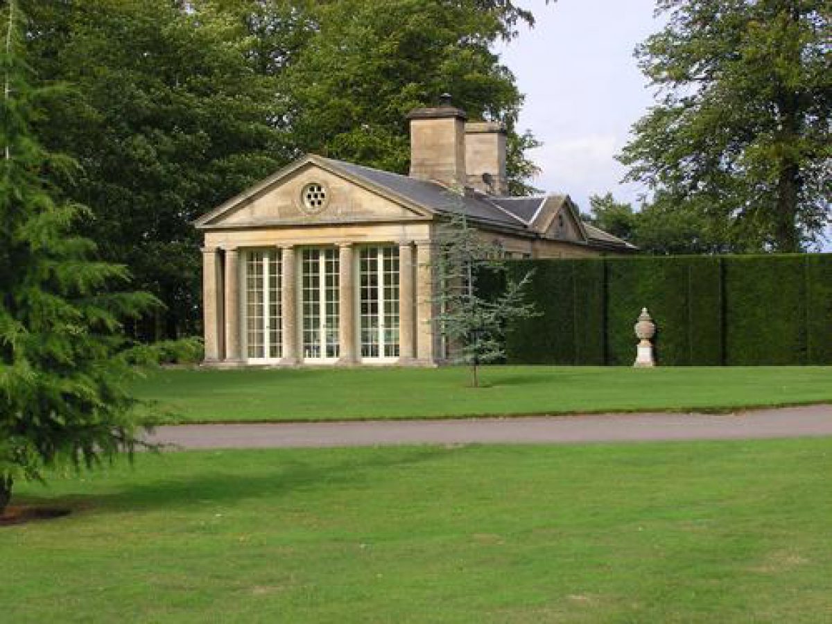 The garden lies to the north and east of the House. The north terrace, reached from the House via a set of stone steps at the north-east corner of the east pavilion, lies against the north front of the House, enclosed by stone retaining walls (the terrace laid out by Robert Campbell c 1860s, with work by Geddes Hyslop c 1935, walls listed grade II). It is laid largely to lawn divided into two terraces, the north boundary being raised above the parkland beyond, which falls away to the north. A circular stone pond (Geddes Hyslop c 1935, listed grade II) lies on the lower, northern lawn, sunk slightly below the main level of the terrace and separated from the park below by the stone retaining wall. It is reached from the upper lawn adjacent to the House by two sets of low stone steps to west and east. The north front is flanked by clipped yew hedges, separating the areas between the House and pavilions from the north terrace.