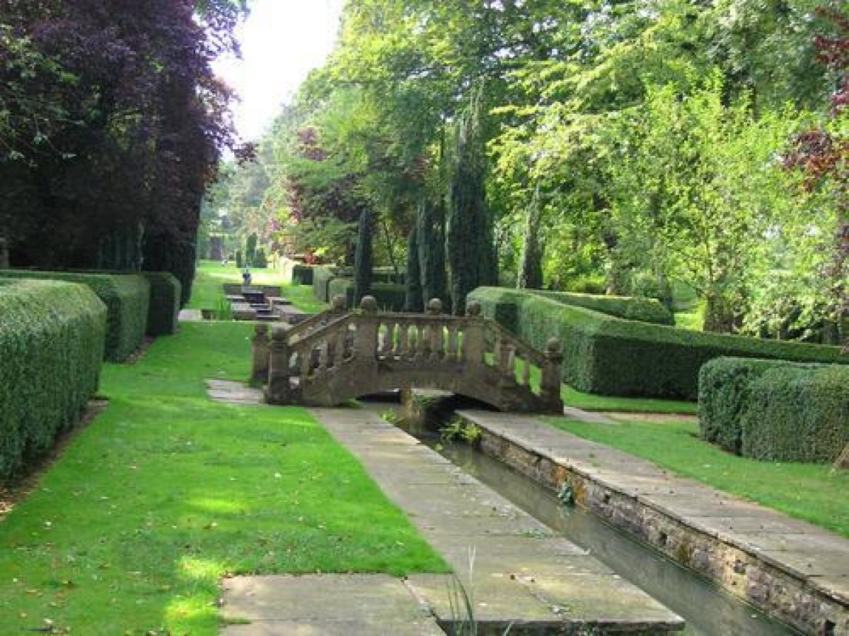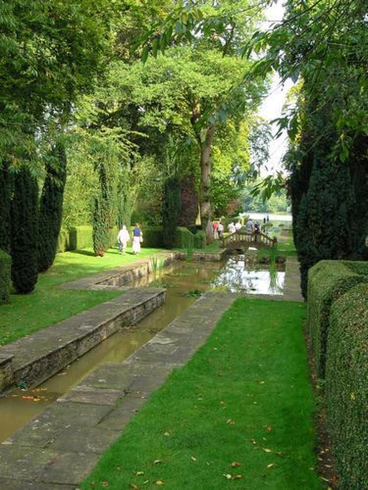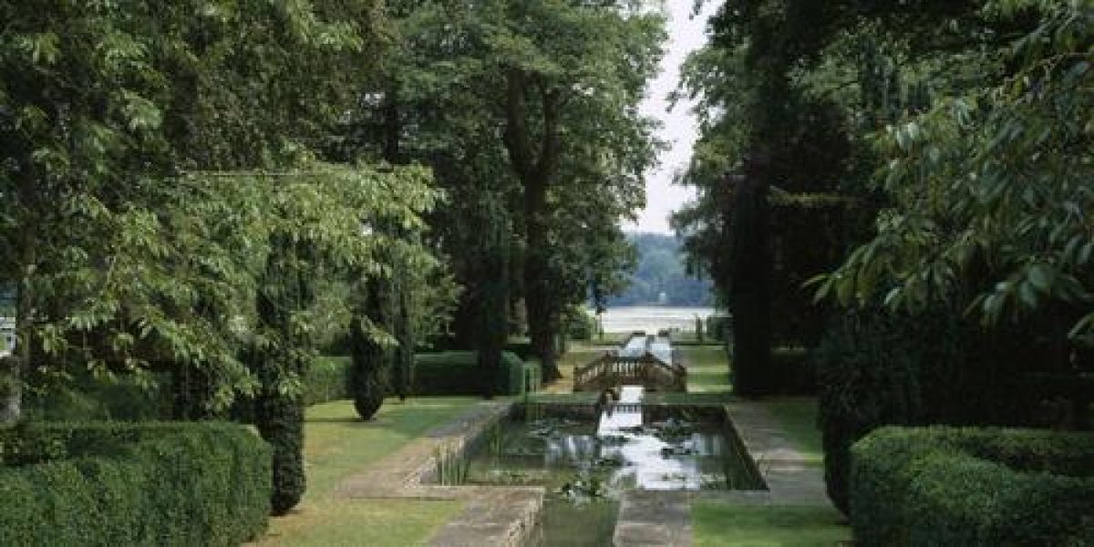 A curved set of stone steps at the centre of the east boundary of the north terrace leads down to informal lawns and woodland, through which a straight cut is driven east towards the west side of the lake, 300m east of the House. Peto's narrow, 250m long axis, running down the shallow hillside, links the House and lake, with a small, white-painted rotunda acting as an eyecatcher at the far, east side of the lake, in line with the avenue and the east pavilion. Peto's formal, 80m long Italianate water garden runs down to the bottom of the axis, drawing the eye east towards the lake from the east pavilion. The water garden consists of a chain of stairways, paths, basins and canals, with fountains, small cascades and a hump-backed balustraded bridge, carried through the woodland and enclosed by clipped box hedges.