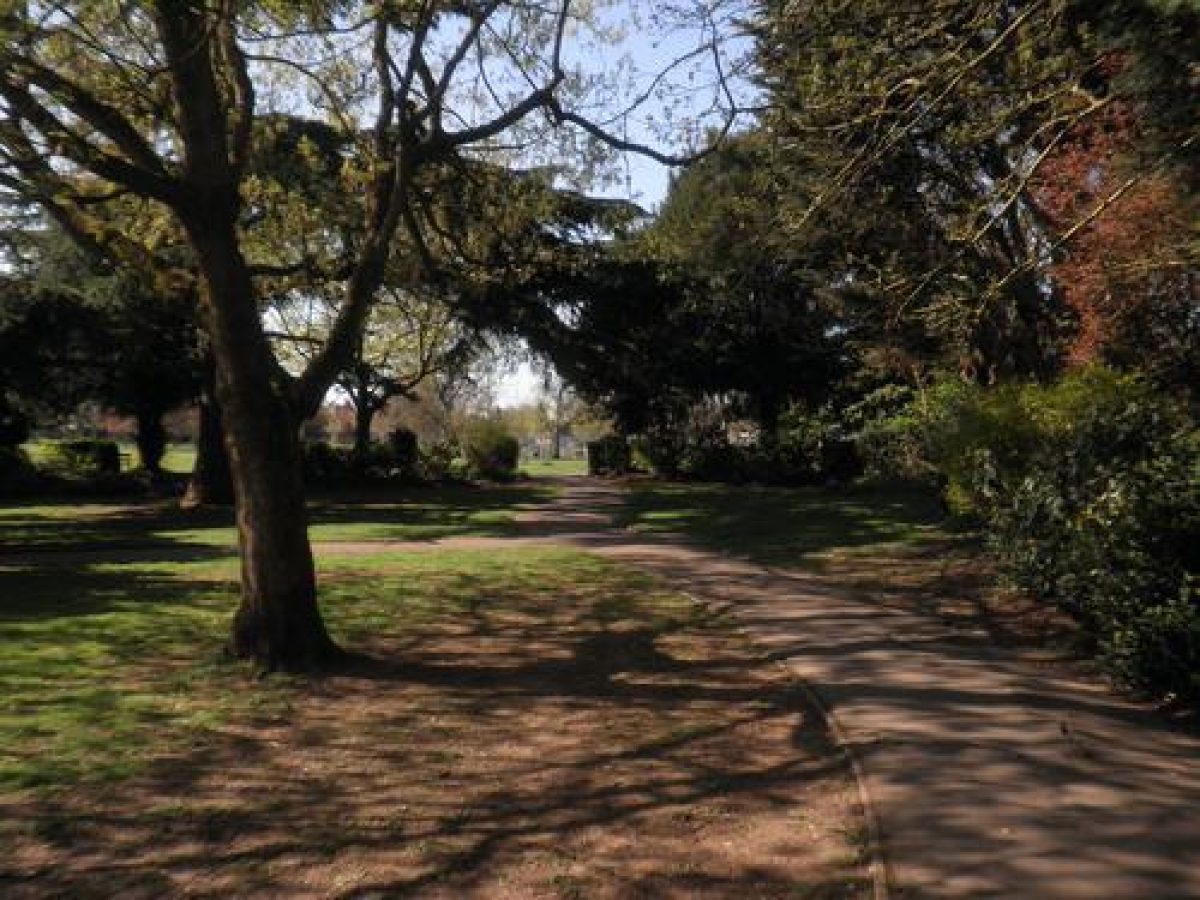 Along the north-eastern side there is a shrubbery. In the northern tip of the park there is a sunken garden with a lily-pond, which is rectangular in shape with rounded ends. Beds of roses surround the pond and cotoneaster grows around the walls of the garden. Around this garden there are several mature trees, including several pines and two Indian bean trees.