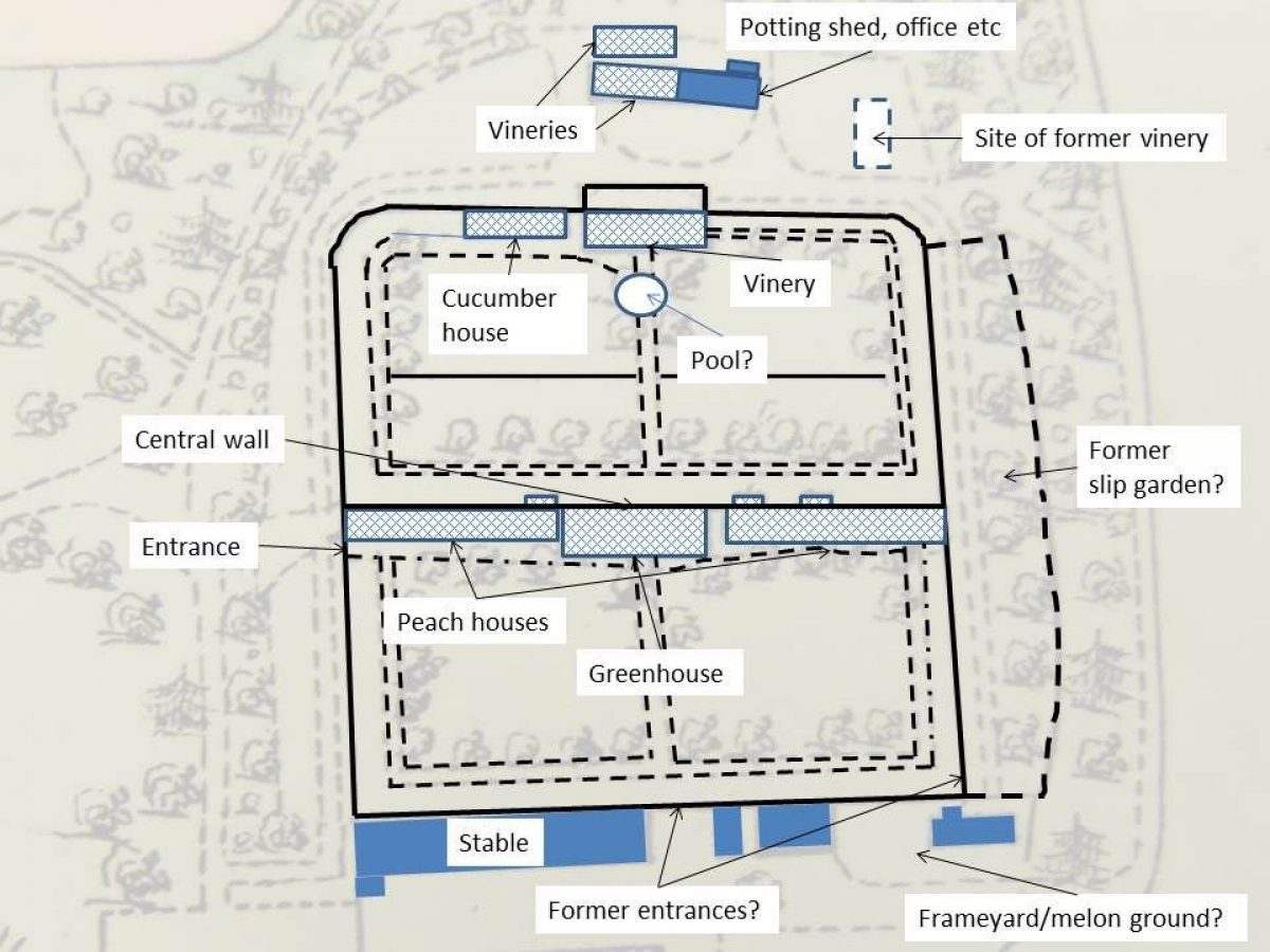 Prior to late 18C, the first kitchen garden was probably in the walled area to the east of the stable block (see Figure 1). Within this area (and near to the stables to provide the dung for heat) were a series of glass-covered frames for melons and cucumbers as recorded on 1st April 1702 at a cost of £2 11s 8d (2/48/16).