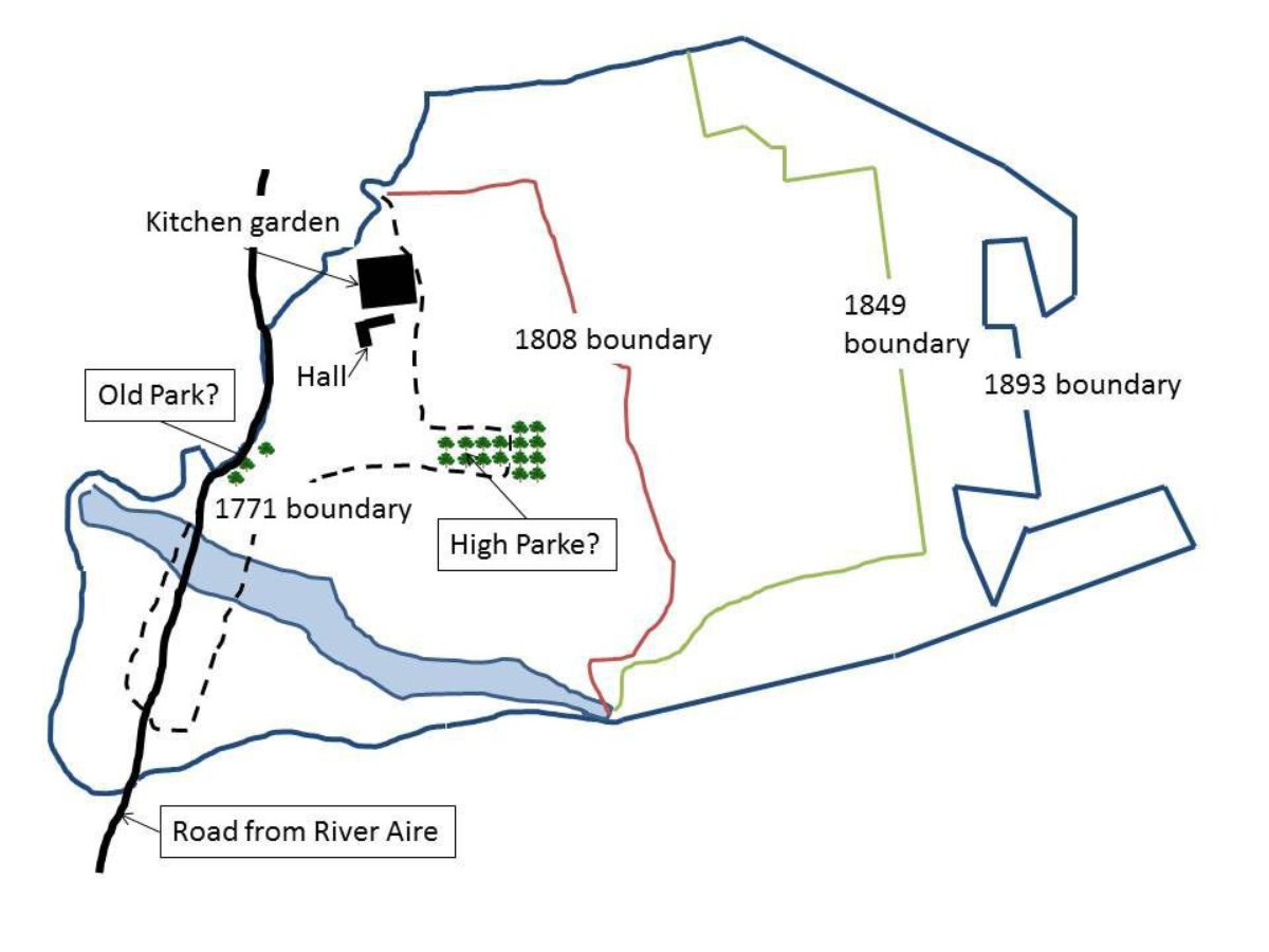 By 1771, these areas had been opened up to form a larger parkland area, implementing the start of the landscaping plan by Woods. The survey of 1789 says that Carlton Park has 102 acres (4/36/12) [again in 1793] and this would appear to cover the area marked on the Enclosure map of 1808 as ‘Hall Garth' (NYRCO WRRD B 26 [MIC 601]). This also replicates the area shown on White's plan as parkland with a shelterbelt to the north and east and planting around the new lake. In the 1839 survey, the ‘Woods, Plantations & Ponds' came to 152 acres, 3 roods and 10 perches (36/31), as the area to the south of the western end of the lake had been included. The park was extended eastwards in the 1840s and again in the 1870s. By the time the estate had come up for sale in the 1893, the park was 279 acres (ERA DDCL3299). The current size of the park is about 300 acres. The changes in the extent of the parkland can be seen in Figure 3.