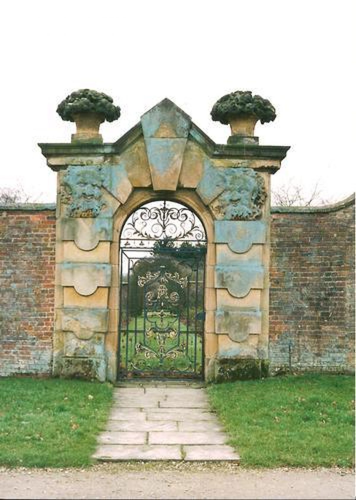 - Description: The Satyr Gate was carved by Samuel Carpenter and is located on the north wall of the Walled Garden.It is an ornamental stone gateway with carved satyr heads on one side and lion heads on the other side. Baskets of ornamental flowers are perched on top of the gate.