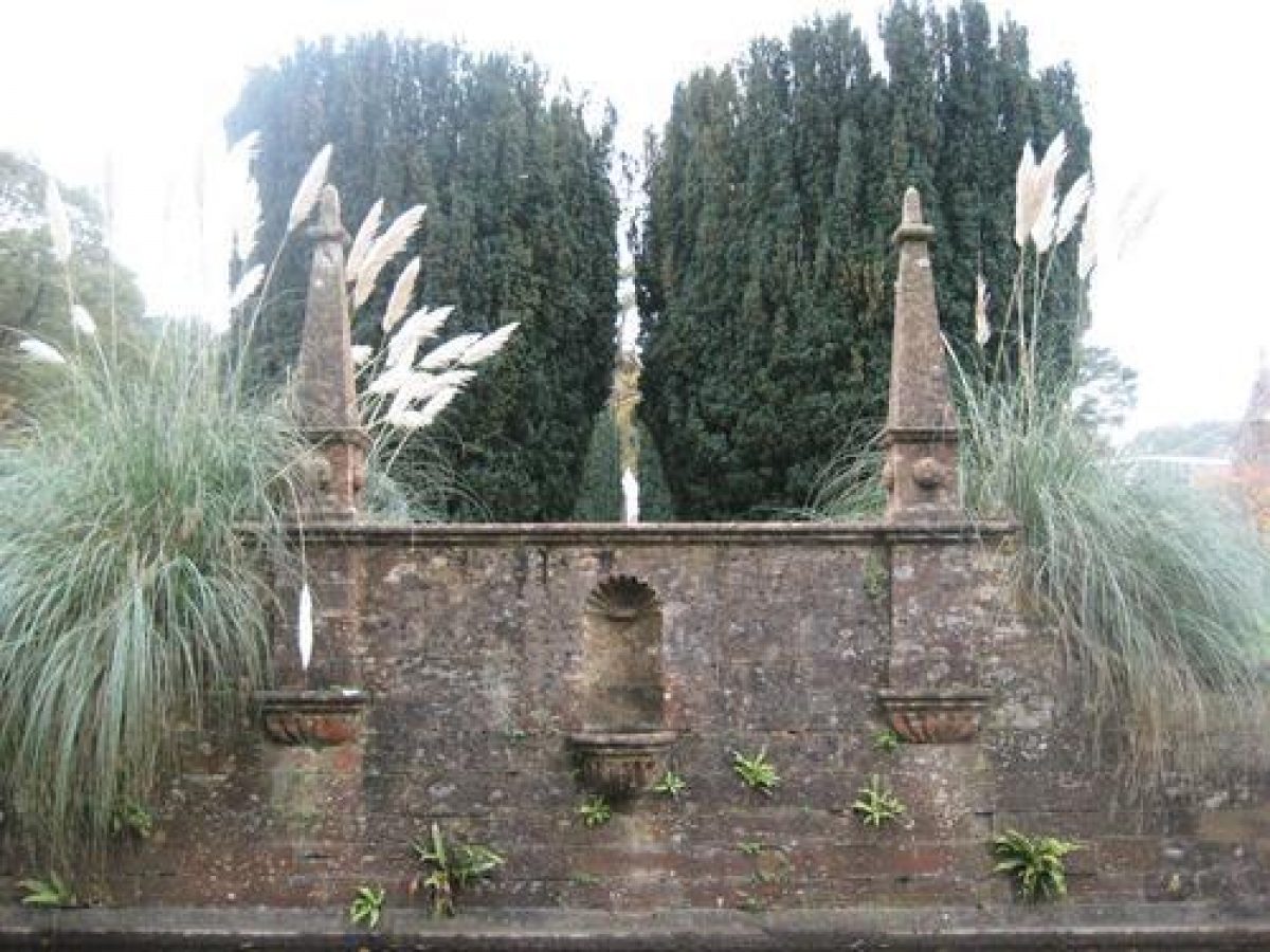 The southern side of the forecourt is enclosed by a stone wall in which is set an arched doorway with a wrought-iron gate leading to the south garden. This approximately square area is laid out with four panels of lawn and a central, circular pool enclosed by stone balustrades. The lawns are separated by gravel walks, while a stone-flagged walk extends along the northern side of the garden, separating the lawns from a herbaceous border. The north-south axis through the garden extends from the forecourt gateway to a balustraded stone bridge, which crosses a stream on the southern side of the garden with an area of bog and rock garden, beyond which is an area of meadow. There is a further east-west axis through the garden, terminated to the east by a stone bench flanked by obelisks, with a shell-headed niche in the retaining wall behind. The walk leading west from here is flanked by Irish yews, and was originally terminated to the west by a flight of stone steps ascending to a croquet lawn. A later flight of steps and a gate with the date 1920 extend the vista westwards, in a wall built on a further terrace above the croquet lawn.