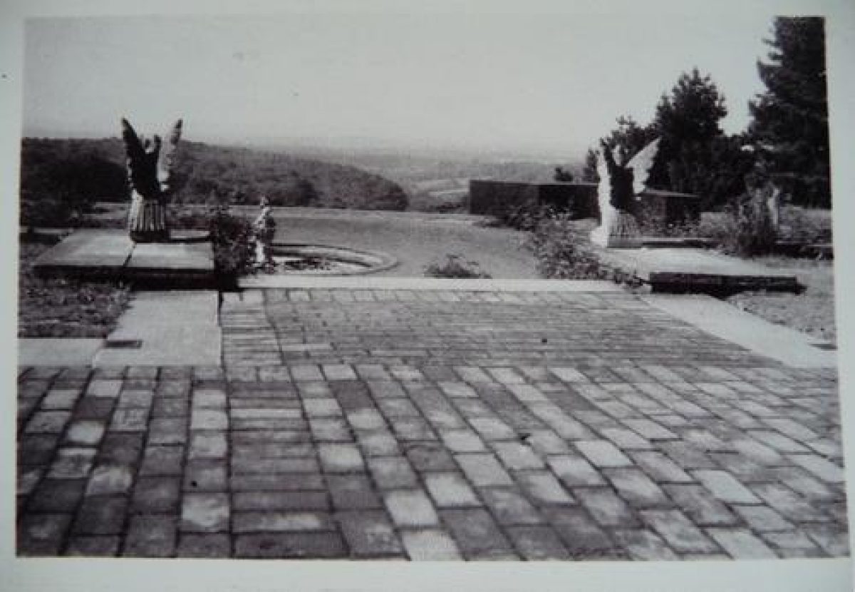 East, south and north of the pergola site are woodland walks, some extending into land now outside the site boundary. Twenty metres west of the pergola and up shallow steps is a garden room, enclosed on its east and south sides by yew hedges, on the west by the east side of Chapelwood Cottage and on the north by a brick wall with an alcove. This garden room contains a series of lily pools set within crazy paving and now surrounded by lawn. Sales Particulars (1938) describe the pools as set within a rose garden. A central rectangular pool is flanked by circular pools linked by water channels (2005, cleaned, repaired and in process of replanting).