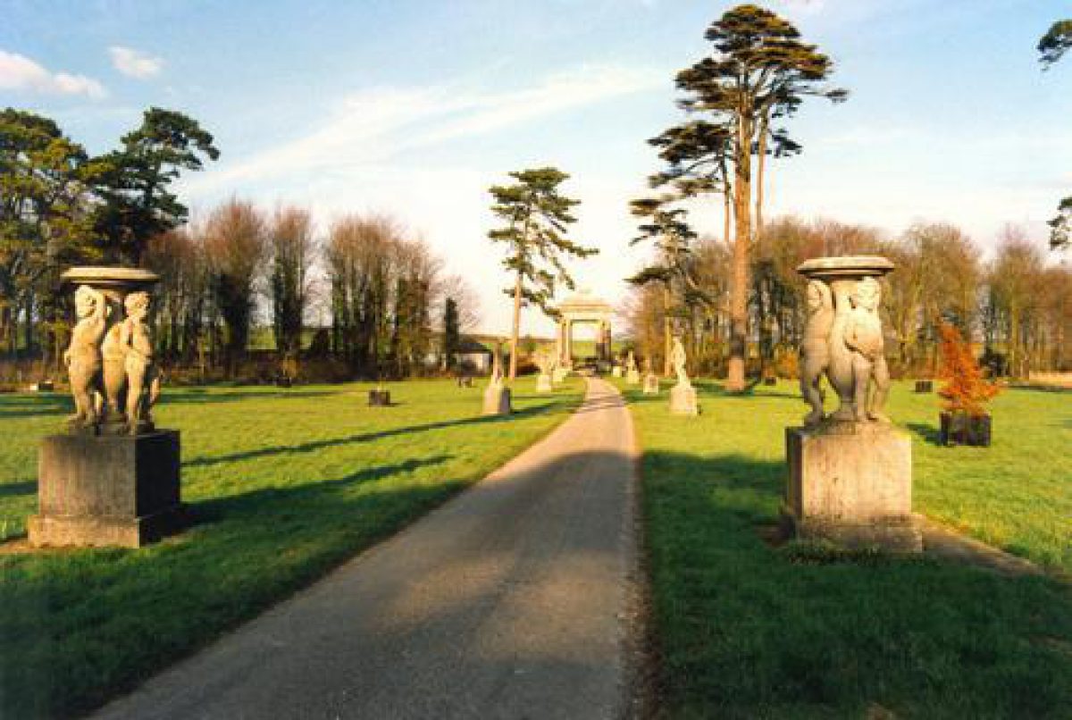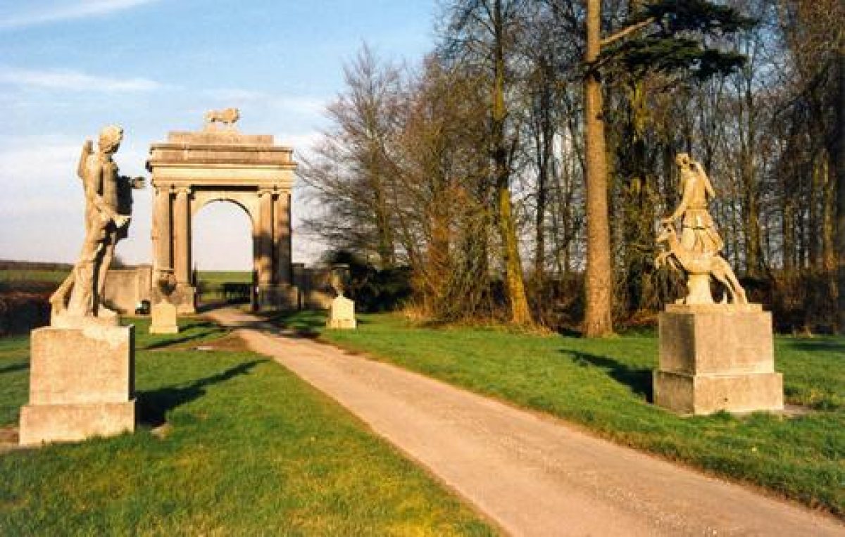 The north-east entrance is situated on the A31 road at a point c 1.5km north-west of the junction of the A31 road and the A350 road, and is marked by Lion Lodge (listed grade II). Lion Lodge comprises an early or mid C19 stucco triumphal arch surmounted by a carved stone lion, the arched opening of which is closed by monumental cast-iron gates obtained from the Great Exhibition (1851). The arch is set back from the road and is flanked by stone quadrant walls. A single-storey lodge-keeper's house stands c 20m west of the entrance. The entrance leads to a tarmac drive which extends c 200m south-west through the remnants of a mid C19 avenue of cedars and pines, beneath which stands a group of C19 composite stone statues and urns.
