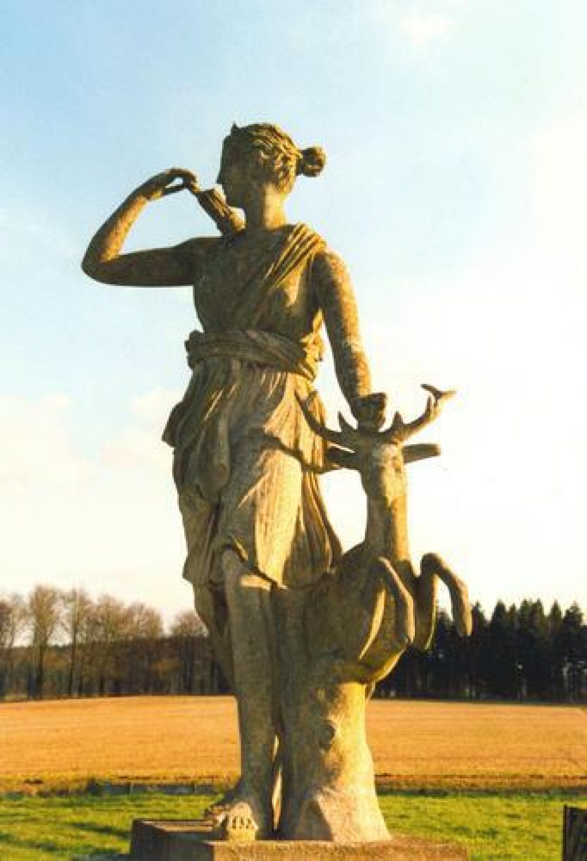 The park surrounds the house and pleasure grounds on all sides and remains (2004) principally pasture, in part grazed by a deer herd. The park is undulating and is characterised by scattered clumps of mature beech trees which frame a series of vistas through the park to the wider landscape beyond. The northern boundary of the park, adjacent to the A31 road, is screened by narrow plantations, while further plantations enclose the park to the east, west, and south-west. To the south-east, the park is wooded and adjoins High Wood (outside the registered area). Some 450m north-east of the house, and visible from it, the Deer Monument (listed grade II) comprises a statue of a stag (possibly Coade stone) set on a brick plinth and flanked by six cannons.