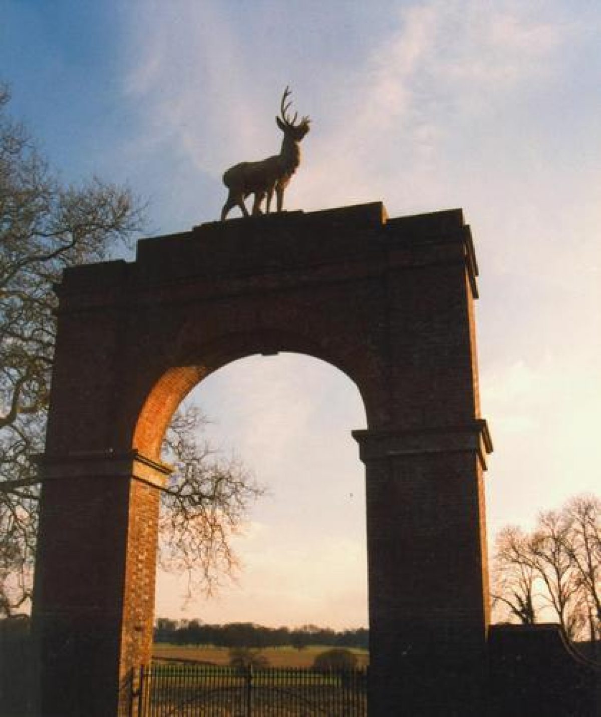 Two further entrances to the site are now (2004) no longer in use. To the north, Stag Gate (listed grade II) stands on the A31 road at a point opposite its junction with a minor road leading to Sturminster Marshall. The early or mid C19 entrance comprises a monumental Roman arch of brick construction surmounted by a lead figure of a stag. The entrance is closed by C19 spiked metal gates; there is no drive beyond the entrance, and none is indicated on the late C19 OS map (1885). Stag Gate corresponds to the point where the Wimborne to Dorchester road was diverted in order to extend the park in 1811-12.
