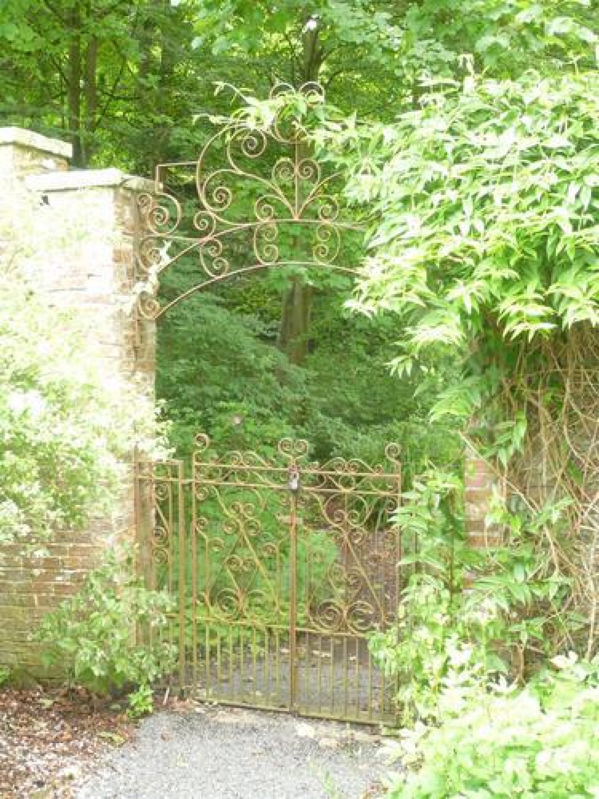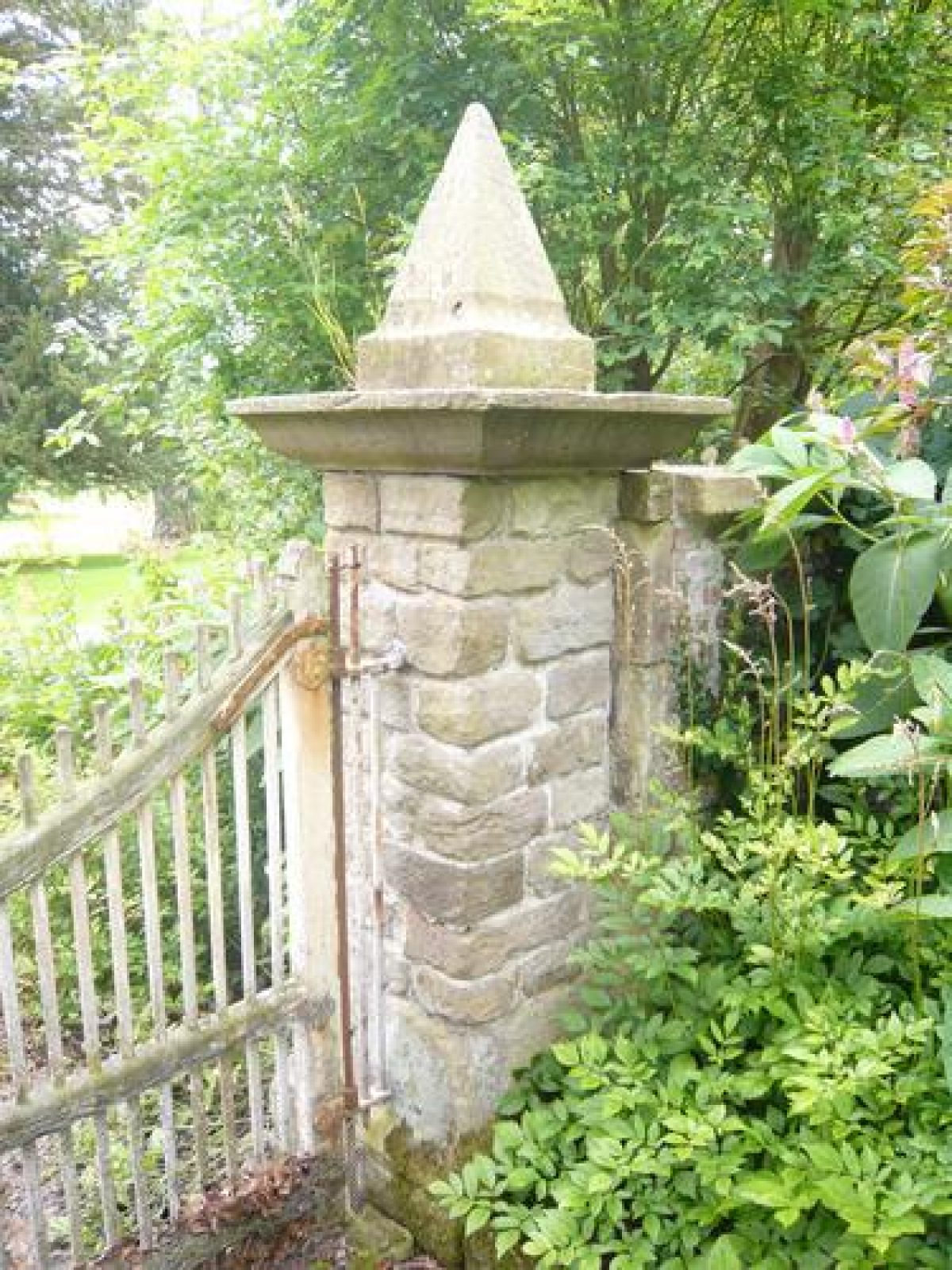 - Description: The south wall gate with gateposts. The gateposts are topped with stone pyramids. It is possible that this is the original formal entrance for guests visiting Chesters House.