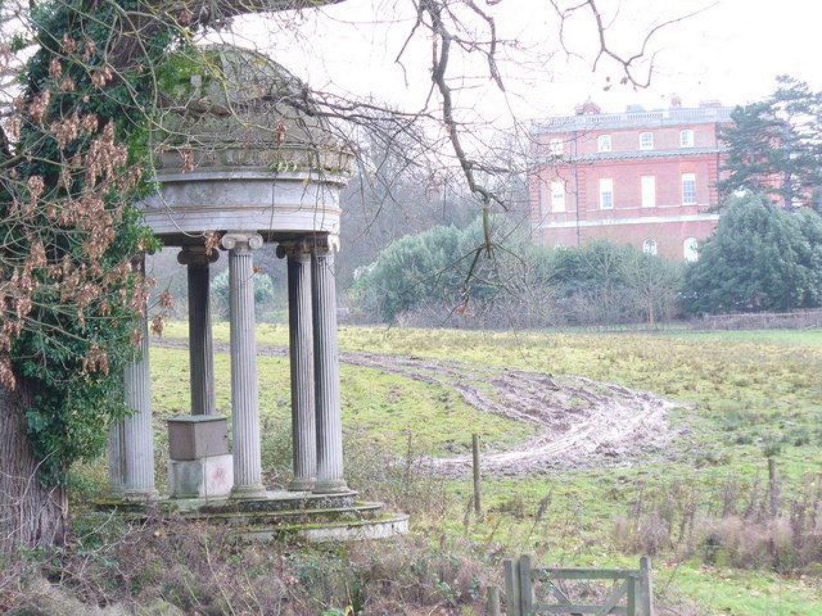 There are three main bodies of water in the park. The South Pool is leg of mutton-shaped and lies 100?300m to the north-west of the House. This was formed by Brown in the late C18 from an early C18 canal. An Iris Garden was laid out along the eastern shore in the late C19 which consisted of a path through swathes of naturalised daffodils and irises, with bamboo. This garden was abandoned before the Second World War but traces of the ornamental planting around the pool remain, including Taxodium distichum specimens and robinia in the woodland on the west side, ornamental planting of bamboo, aucuba, rhododendron, gunnera, and pear amongst the scrub at the southern end of the pool, and lilac, cedar of Lebanon, Monterey pine, and holm oak in the wood to the north of the pool. A circular stone temple with a copper dome supported by six Ionic columns (W and H W Inwood 1838, listed grade II) stands c 200m to the north-north-west of the House on the north-east edge of the South Pool. It was moved to this location in 1924 from Clandon Regis. The temple is backed by woodland on the east side of the South Pool, planted after 1897 with ash and hazel coppice. A late C19 boathouse and an ornamental bridge across the lake no longer exist.