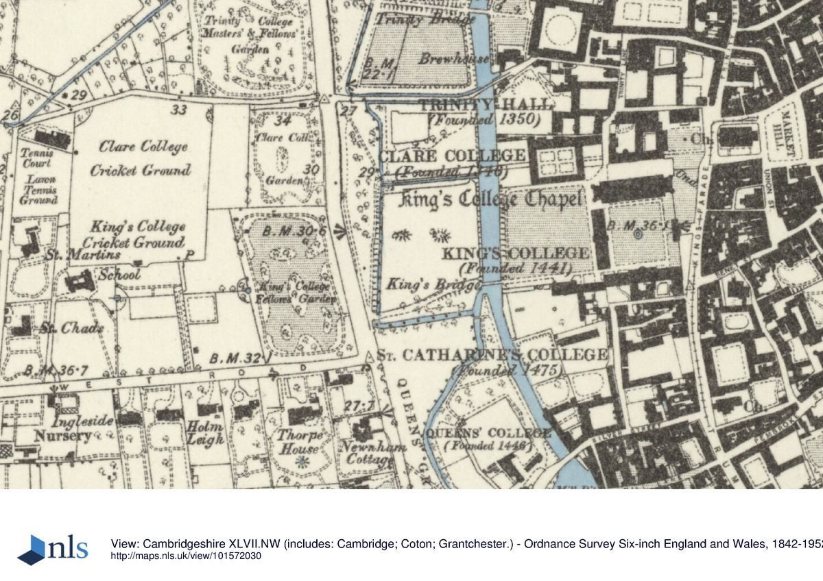 Clare College lies at the centre of Cambridge, on flat ground surrounded by drainage ditches. The c 3ha college is bounded to the north by Trinity Hall (qv), and, west of the River Cam, Trinity College land (qv), to the east by Trinity Lane and beyond this the old University buildings, and to the south by King's College (qv) which runs parallel to it. Clare College is set within a group of city-centre colleges, cut from north to south by the River Cam and by Queen's Road, the area between river and road forming the centre section of the sequence of five adjacent college gardens and meadows which, taken together, are known as The Backs. In 1779 Lancelot Brown (1716-83) provided a plan to landscape The Backs, including that part of Clare College west of the river. He intended to widen the river into a serpentine lake, and remove the boundaries between individual college grounds together with King's, Clare and Trinity College bridges, using King's College Gibbs' Building as the substitute focal point for a great house. This plan was never carried out and The Backs remain individually owned and designed pleasure grounds and gardens.