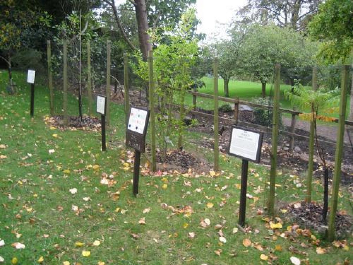 A path leads south-east from this enclosure into the arboretum, containing trees, shrubs, and plants imported from America to England; this was established from c 1980 and formally opened in 1984 in a formerly overgrown area. West of the top of the steps a lawn with ornamental trees curves round to the west, onto a south-east-facing terraced bank with gardens on different levels. An ornamental iron gateway (c 2000) set in a balustraded wall 10m west of the steps leads south-west to stone steps down into the Mount Vernon Garden (1960s), a replica of part of George Washington's 1784-5 flower garden in Virginia; this was laid out by Ian Mylles on the site of a former rose garden.