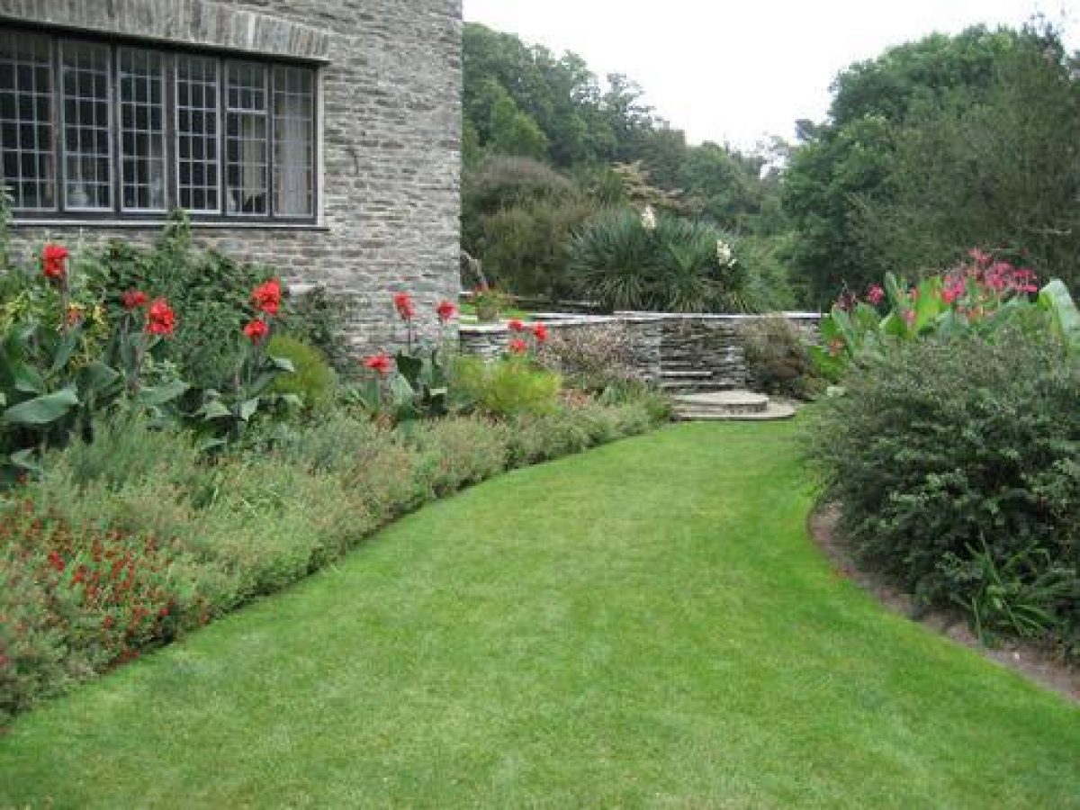 Below the south façade two terraces retained by slate rubble walls were designed by Milne to provide an architectural setting for the house and as a vantage point for views over the valley garden, and, at the time of construction, for views to the sea. The upper terrace comprises a lower section of c 10m to the south-west, and a higher section c 20m in length to the east, linked by stone steps. Each section has a stone-flagged walk between panels of mown grass. Borders below the house walls are planted with tender herbaceous plants, shrubs and climbers, and a mature leptospermum grows in the flagged walk as shown in photographs published by Country Life in 1930. Semicircular stone steps at the south-west end of the upper terrace lead to a lower terrace where a grass walk is bordered by herbaceous plants to the north and Dierama on the south or outer side. The walk turns north-east and then east, echoing the plan of the house, with corners and changes in direction marked on the outer side by staddle stones.