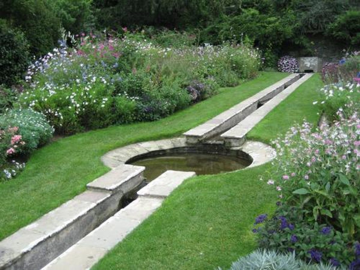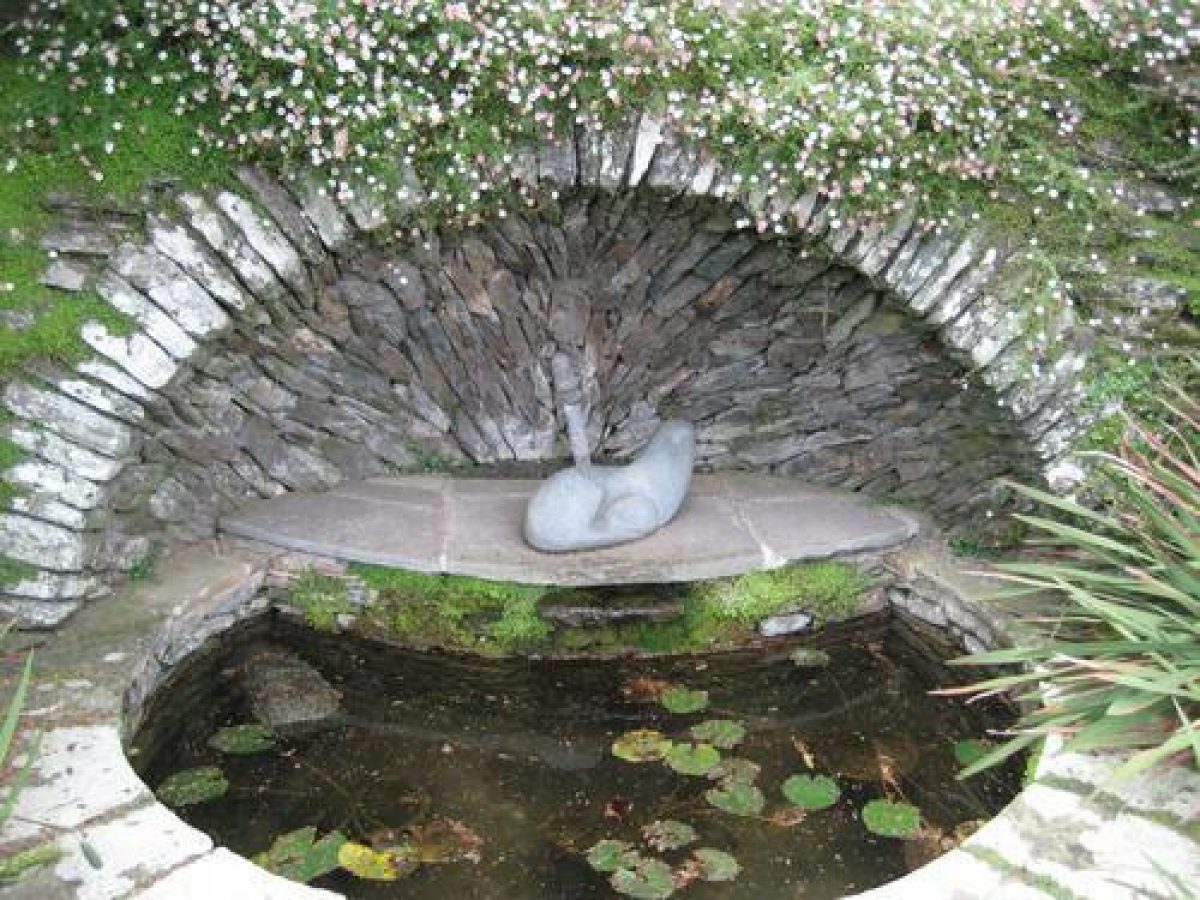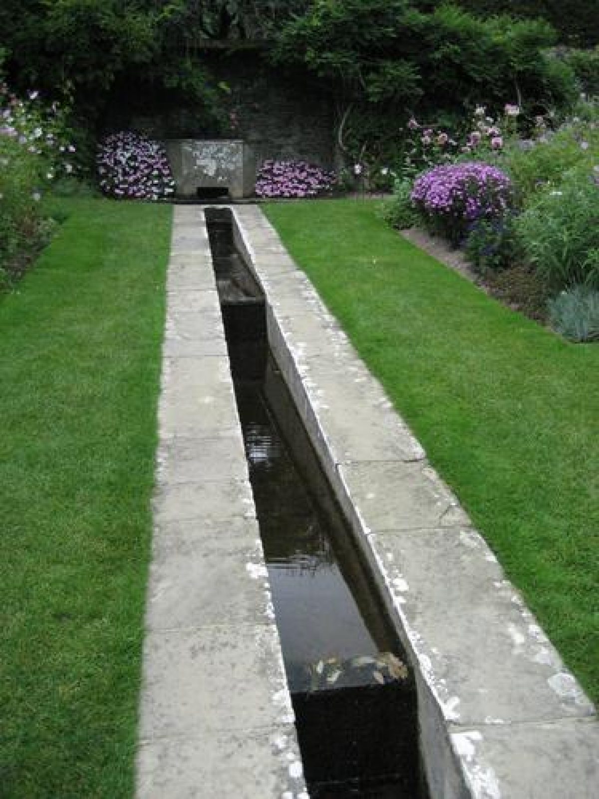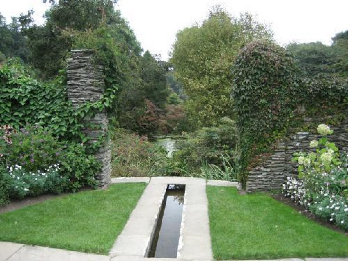 The principal walk running through the valley leaves the drive to the north-west of the carriage court. To the south a broad, stone-flagged walk, The Seemly Terrace, is planted with foliage plants and leads to a flight of circular stone steps which descends to the Rill Garden below the west side of the house. Enclosed by stone walls c 2m high, the Rill Garden was originally planned as a rose garden, but now (1998) contains four beds planted with semi-tender plants, together with tender shrubs and climbers on the walls. A canalised stream flows in a deep stone-kerbed channel from a cistern and pool at the north-west end of the garden, through a series of shallow cascades and a circular pool with a concave stone rim.