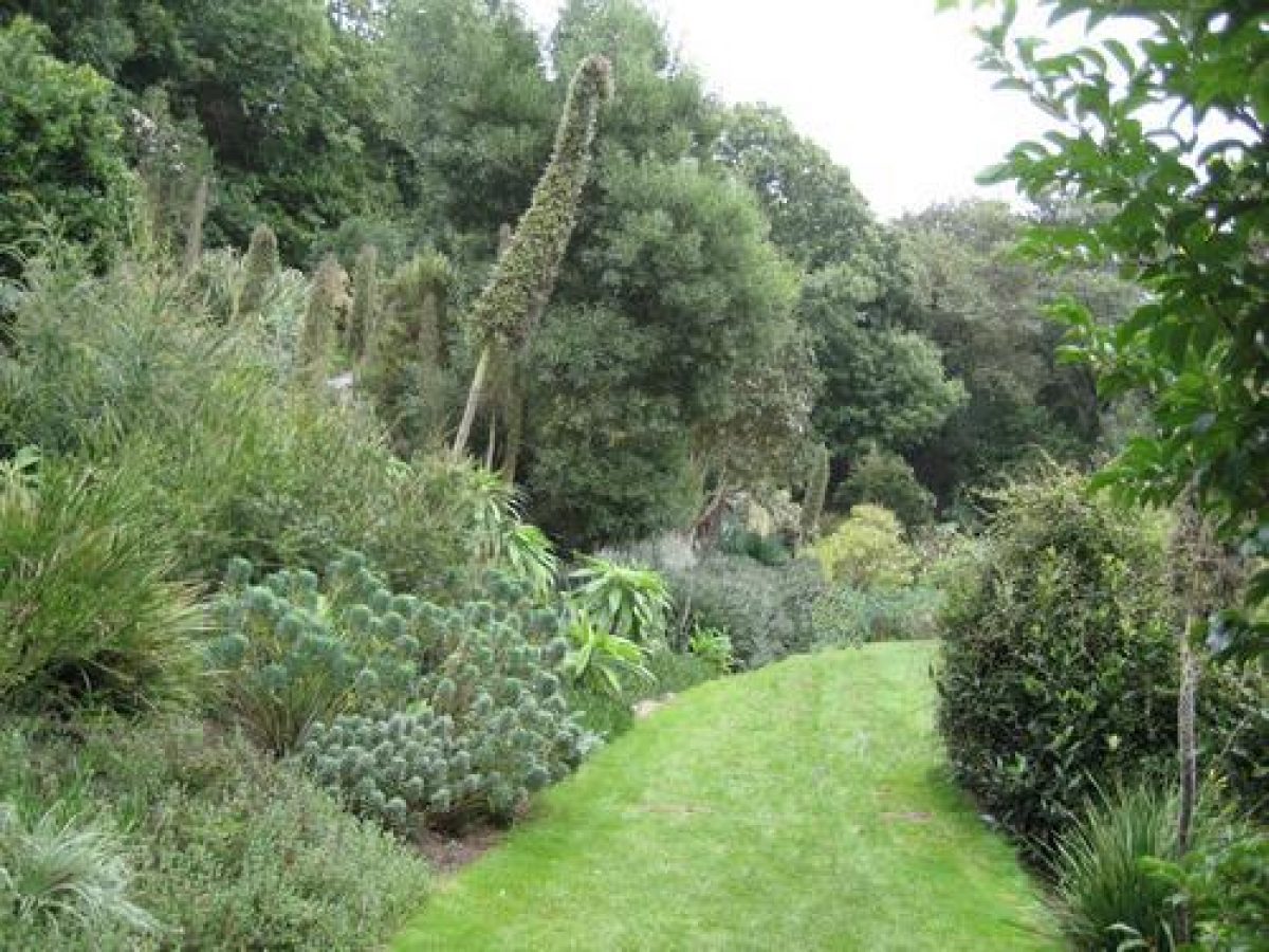 The principal walk follows the course of the stream along the north side of the valley, passing pools immediately below the house and c 100m south-east. Beyond the lawn below the terraces the walk passes through a series of glades with planting including bamboo, rhododendrons and rare specimen trees and shrubs. After c 200m the planting recedes and the walk passes through an open area of mown grass which slopes up to the north. Today (1998) the walk crosses the stream on a timber bridge and continues south to the timber gate which gives access to the coastal footpath. The stream to the east of the walk is planted with tree ferns and shrubs including camellias and hydrangeas; to the west an open grass glade is enclosed to the north and west by pines and shelter planting.