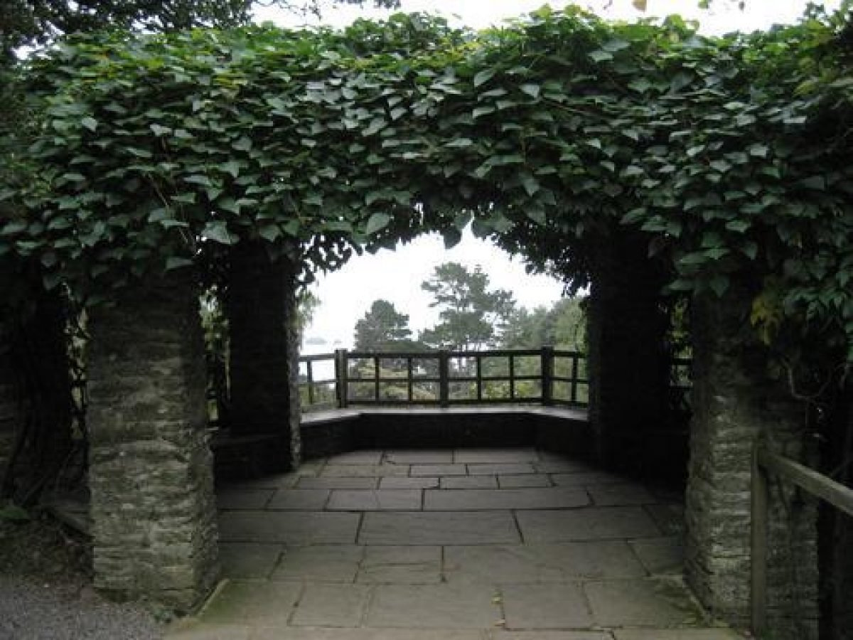 The Gazebo Walk leads south-south-east from the east end of the Bowling Green with Mediterranean foliage plants on a bank below shelter planting to the north. Gradually turning south-east, the gently sloping grass walk reveals a pentagonal stone-paved gazebo which frames a dramatic view of the sea and the Mew Stone. Square stone piers support timber beams covered with vines and wisteria, and low stone parapet walls back timber seats. Views back to the house photographed in 1930 (CL) have been lost due to the growth of trees and conifers on the slope below the Gazebo Walk. To the north of the Gazebo Walk a minor path leads north-east through early C20 shelter planting to Paddock Wood, an area of late C20 shelter planting which replaces early C20 trees lost through storm damage. The walk continues east to reach a long series of steps which follows the eastern boundary of the garden south to join the principal walk c 350m south-east of the house. Beyond the gazebo, a series of grass walks lead east and south-east along the north side of the valley through ornamental trees and shrubs. Below the gazebo, the quarry from which the stone for the house was removed has been planted with Agapanthus, Phormium, heaths and a fig tree.