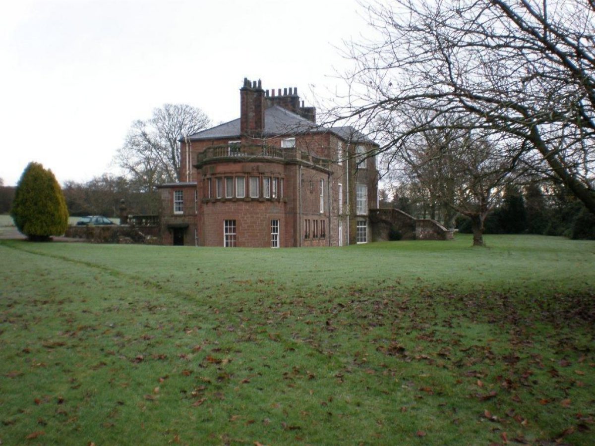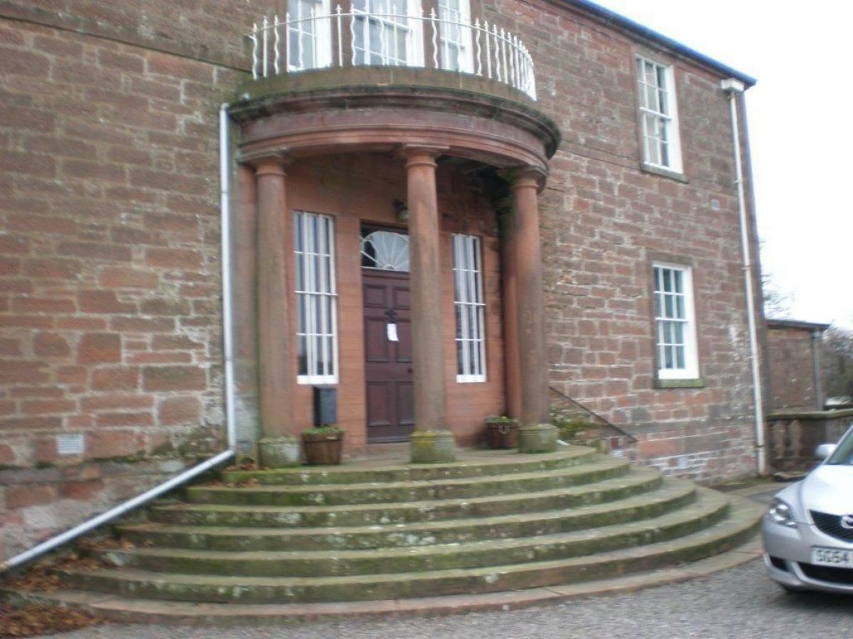 - Description: A two-storey, three-bay house with basement and a lower north wing. Constructed of squared red rubble with polished margins and dressings. On the east elevation of the original house is a central Roman Doric-columned semi-circular porch above a flight of concentric steps. The roof is piended slate.