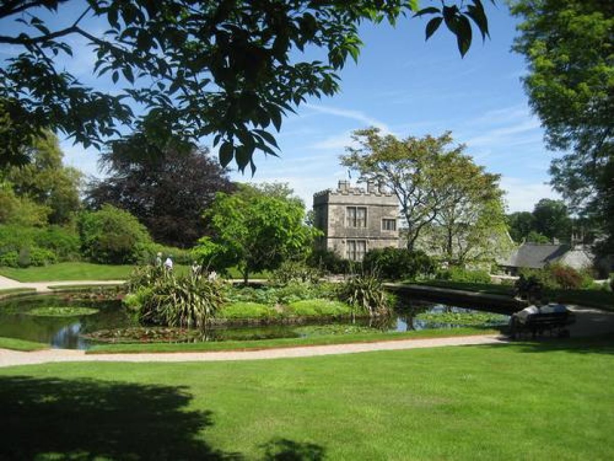 The formal gardens lie to the north, east, and west of the house, with informal woodland gardens in the valley to the east. The formal gardens to the north and north-west of the house, an orchard to the south-west, and the bowling green to the south are enclosed by partly crenellated stone walls, that to the west listed grade II.