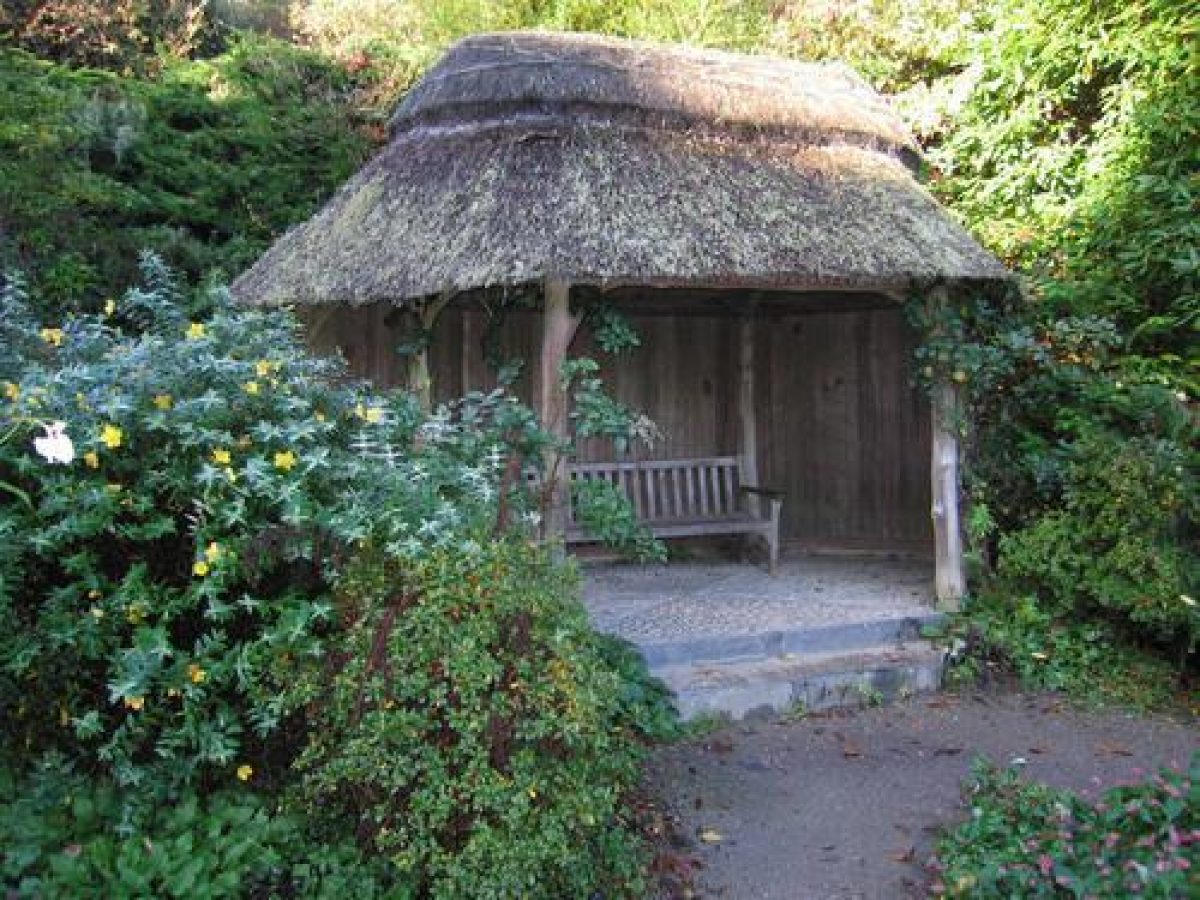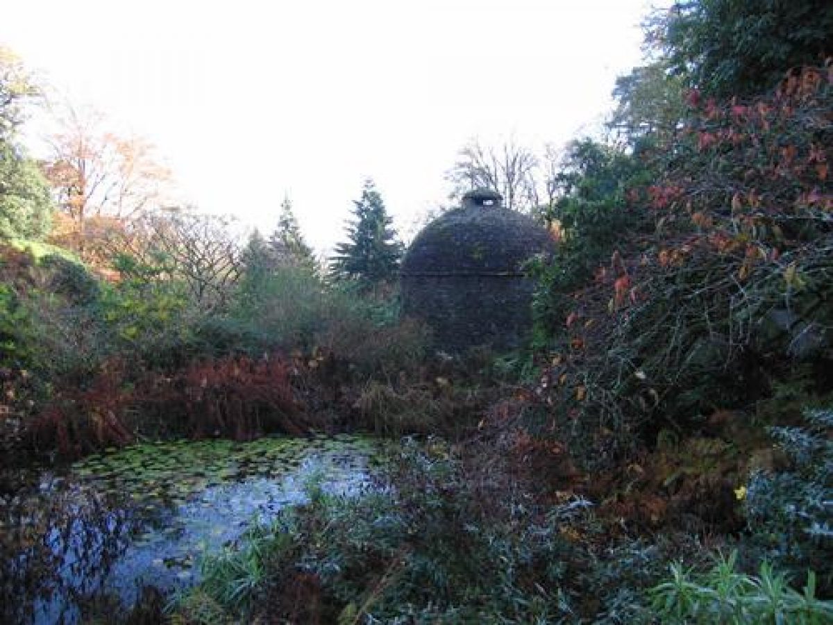 The head of the valley is formed into a terrace, with a stream being dammed to form an approximately rectangular pond c 50m east of the house. This pond is possibly of medieval origin, and may have served as a fishpond to supply the household (Pett 1998). To the north-west of the pond stands a rustic timber and thatch summerhouse on a cobbled base; this late C20 structure replicates a late C19 summerhouse which is known from photographs. The terrace is lavishly planted with herbaceous and moisture-loving plants, together with mature rhododendrons and other ornamental shrubs. Below and to the south-east of the terrace stands a stone dovecote (listed grade II*). Of late C16 or early C17 construction, the dovecote is circular on plan and is covered by a domed stone roof with a central lantern providing access for the birds. The stream which flows east through the valley below the fishpond is formed into a series of pools and cascades which are constructed from white quartz.