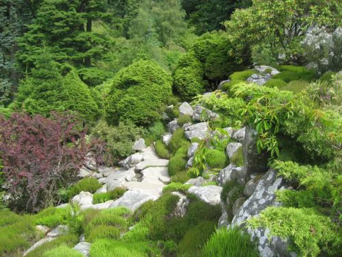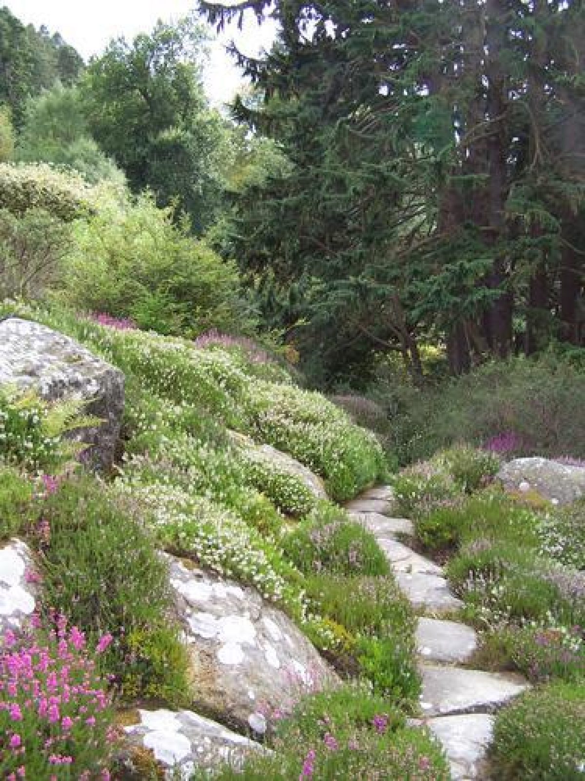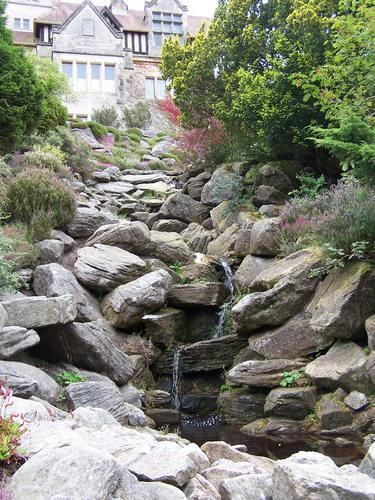 The rock gardens are located on the slopes surrounding the house to the west and south. The area is made up of large amounts of sandstone. Heathers and other alpine plants are dispersed amongst them. There are also two cascades.