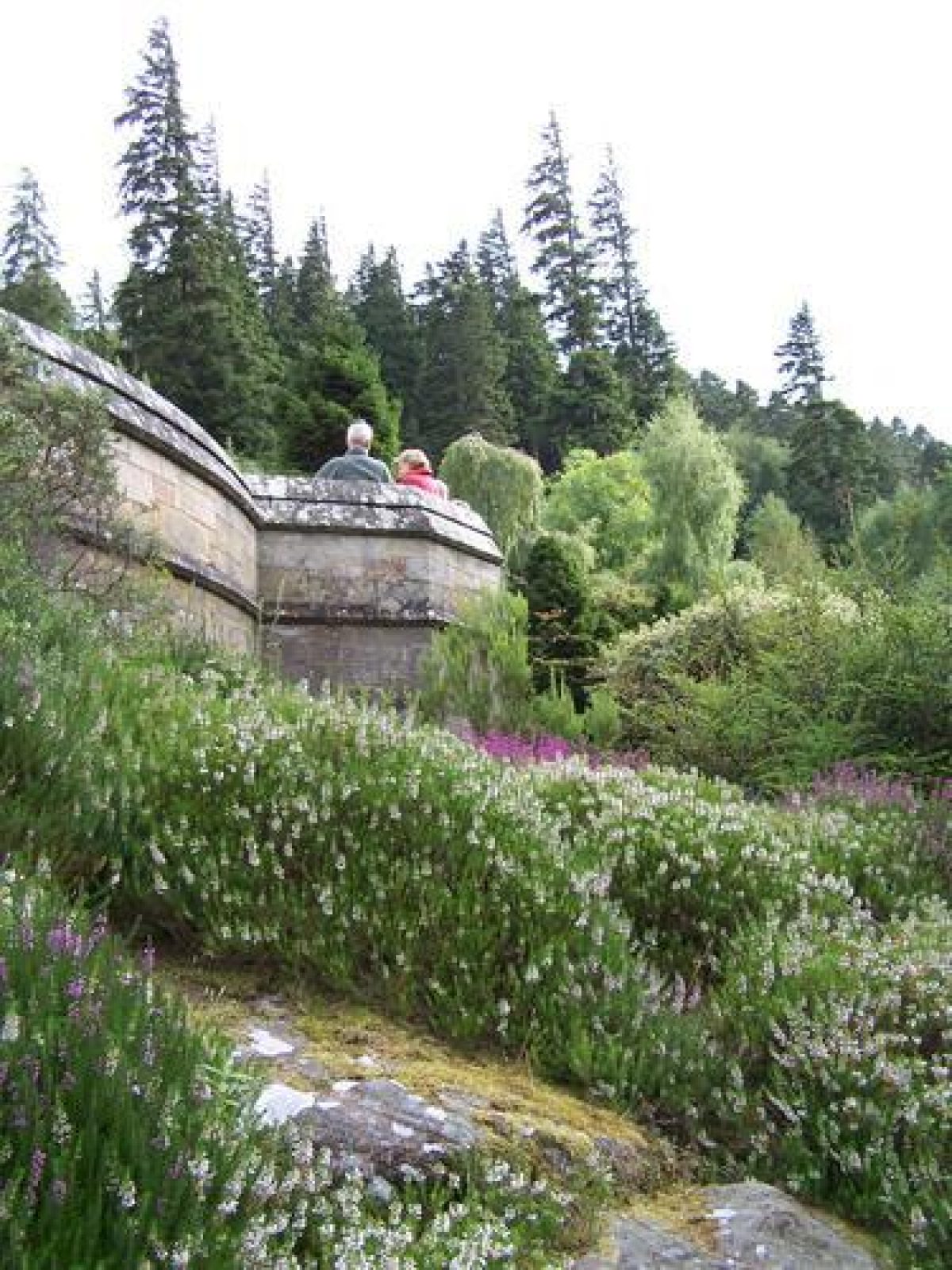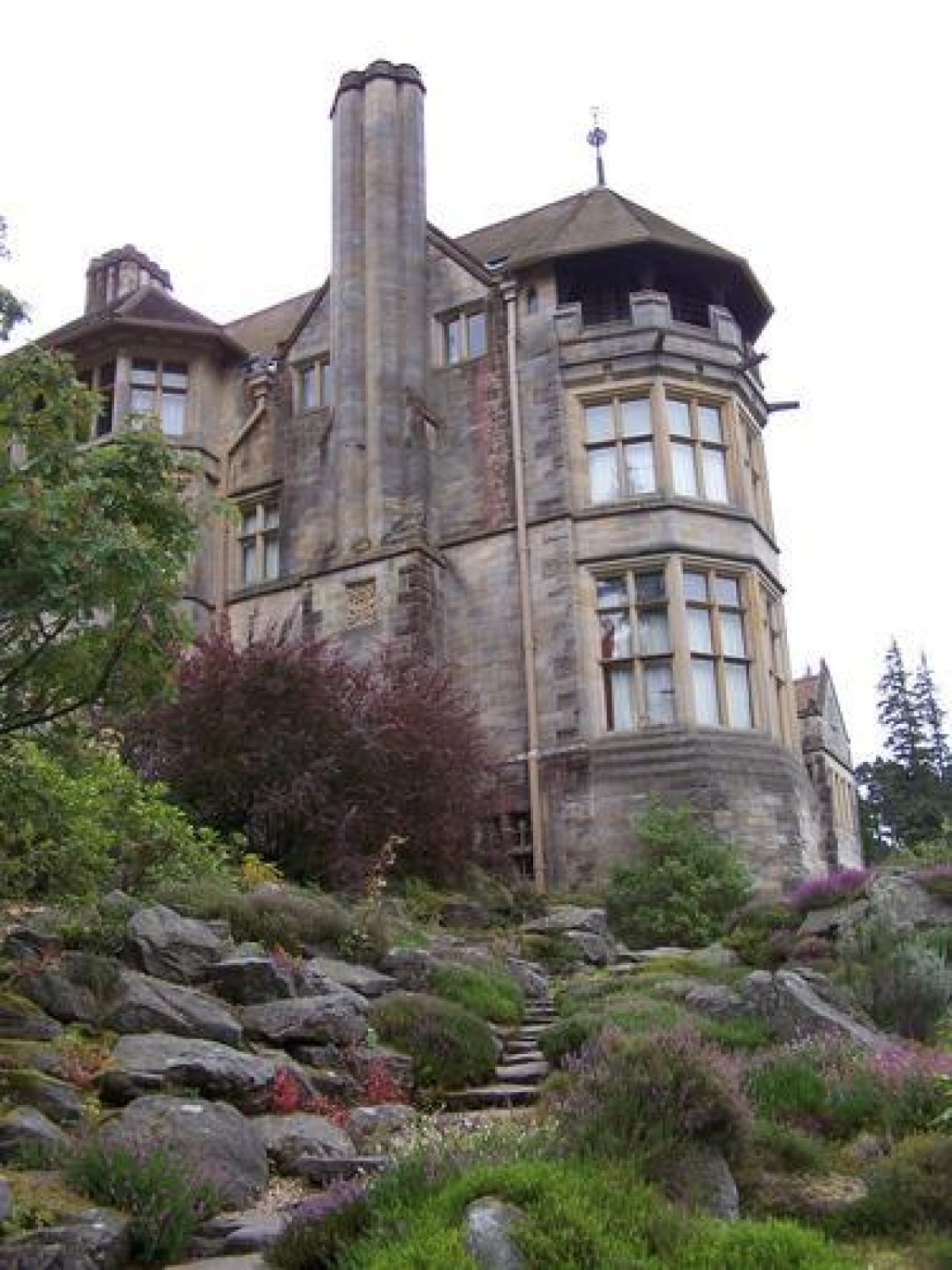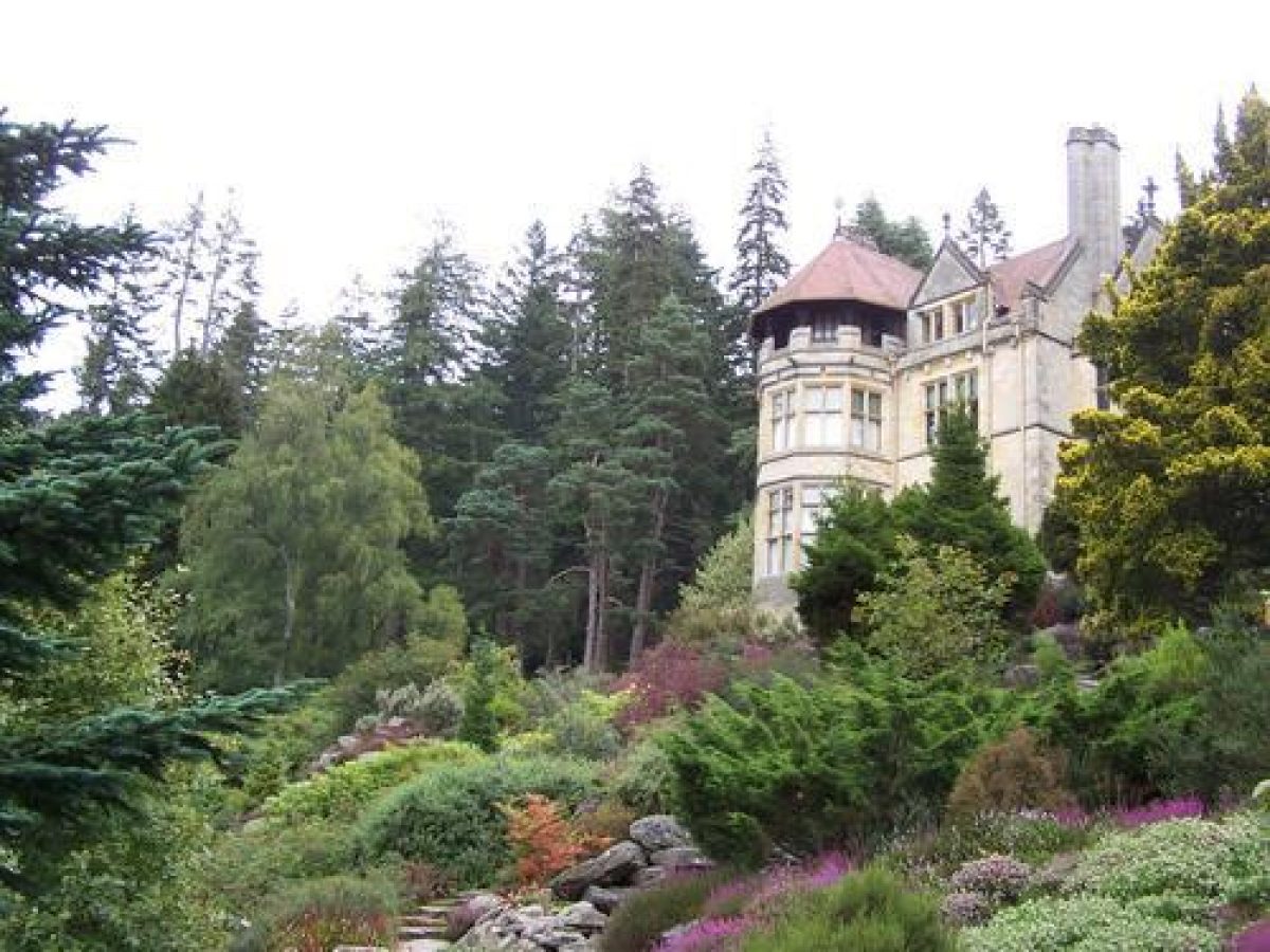 The rock gardens are located on the slopes surrounding the house to the west and south. The area is made up of large amounts of sandstone. Heathers and other alpine plants are dispersed amongst them. There are also two cascades.