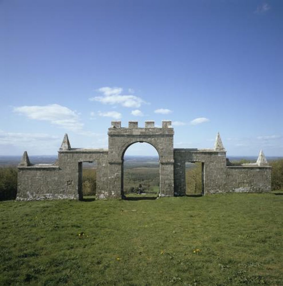 To the south of the house, and on an axis with it, blocks of planting and a pair of stone urns set on pedestals frame the northern end of a vista cut through Great Wood to Creech Arch which stands on the crest of the escarpment c 500m south-south-east of the house. Creech Arch (listed Grade II*) is constructed in ashlar and comprises a central arched opening surmounted by crenellations, which is flanked by lower wing walls in which are set square-headed openings. These are in turn flanked by lower wing walls, and the changes in height are marked by pyramidal finials. The arch was constructed by Denis Bond before 1746 to serve as an eyecatcher from the Grange. The southern vista is delineated on the mid-C18 garden plan with a circular lawn leading to three radiating glades, the central one aligned on a single arch and the other two aligned on pyramids or squat obelisks. It is unclear whether this scheme was ever realised, and the radiating glades are not shown on the 1888 OS map.