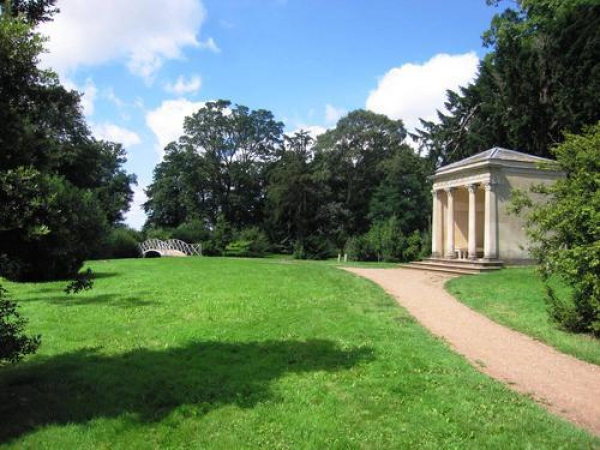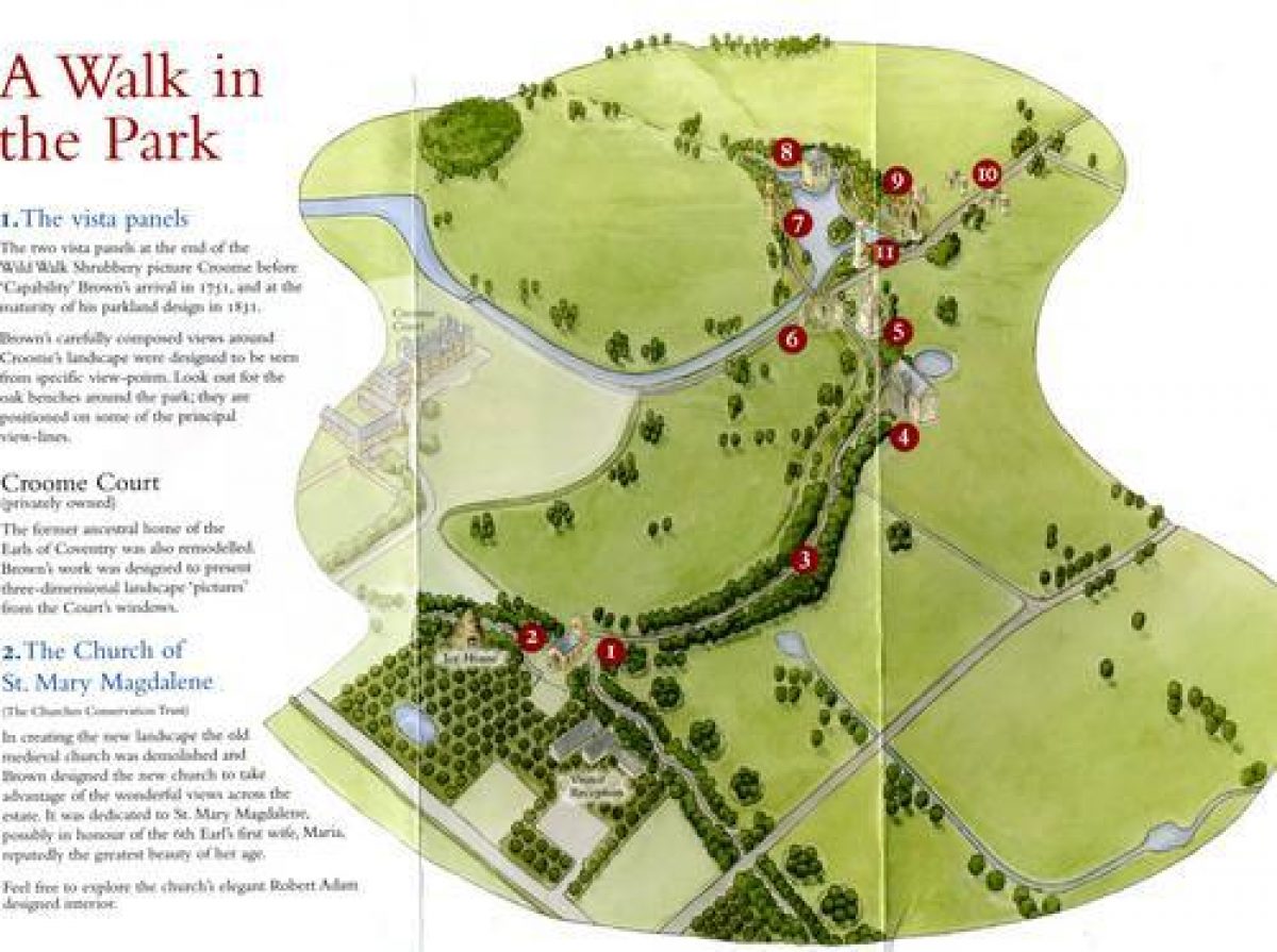 Croome Court is a house of 1751 in a mid-18th-century landscape park by Lancelot Brown featuring circuit walks and drives, ornamental water features and a wide range of garden buildings.
