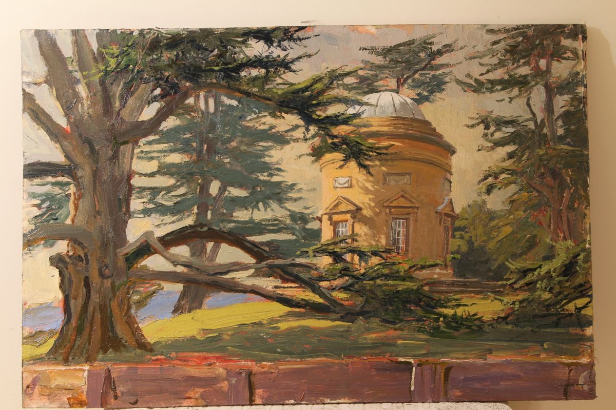 The ridge on which the church lies and which runs down the east side of the park has on its top three 'eyecatcher' buildings, linked by walks: the church itself, 500m north of the house; the Rotunda (see above) 350m east of the house; and the Park Seat. This last (often known from the C19 as the Owl House; listed grade II), is a Bath stone temple or seat 100m east of and above the south end of the Croome River, looking down the River and across the park to the house 1km to the north. It was designed in 1766-7 by Robert Adam. From it a footpath leads north-west, with the plantation belt and park wall to the west, to Westfield Farm (incorporating C18 'cow shades'), and thence to complete the circuit walk to the south end of the lake.