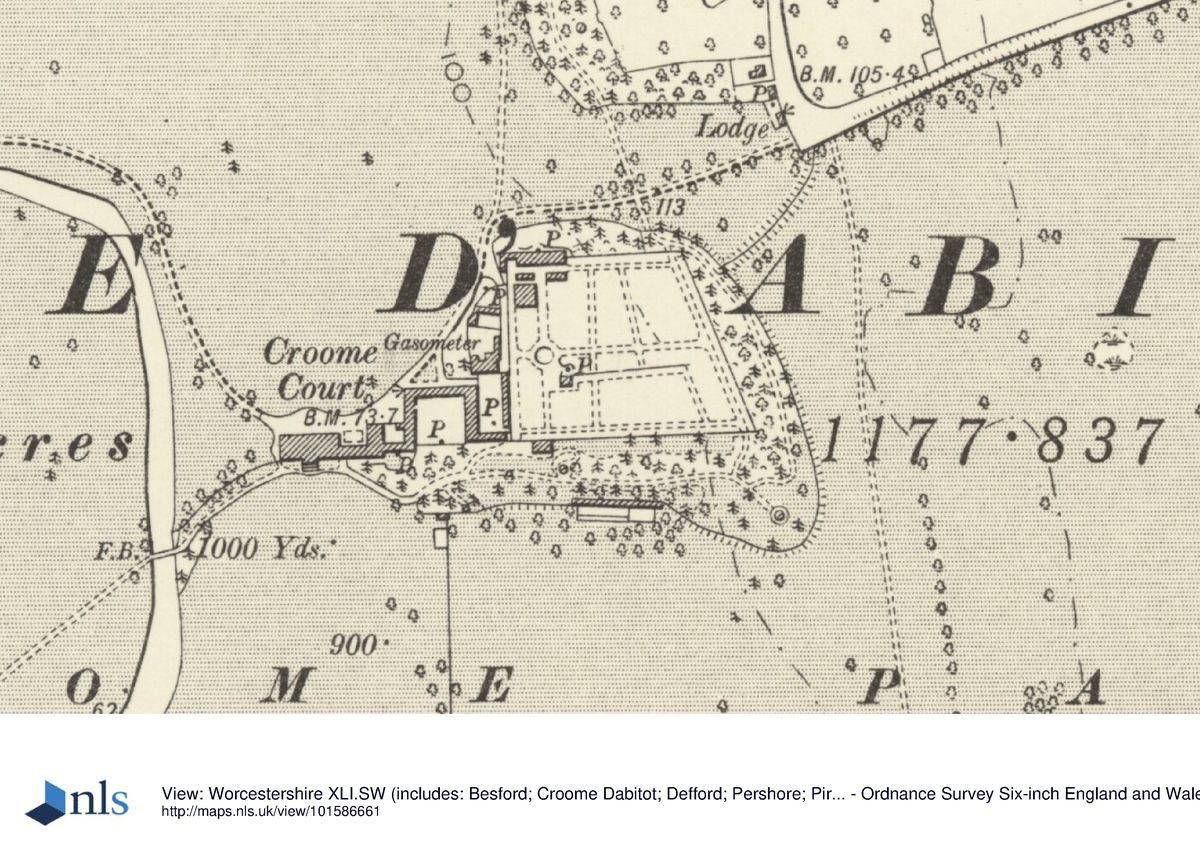 The nearest entrance to the house is the Pershore (or London) Lodge and gates (listed grade I), 400m north-east of it. Comprising a Triumphal Arch with two-storey lodge (rebuilt 1877) on the north side, all in Bath stone ashlar, the entrance is of 1779 and was probably designed by Robert Adam (1728-92) and altered by James Wyatt (1747-1813) c 1800. From here the drive, which continues the old line of the public road which was diverted around the outside of the park by Brown in the early 1750s, runs in a straight line across a lawn for c 150m. The drive then dips and sweeps south towards the north front of the house, successive views being obtained across the park of the Panorama, the Temple Greenhouse, Brown's church, Croome Court itself and further afield to May Hill, the Malverns and Bredon Hill.